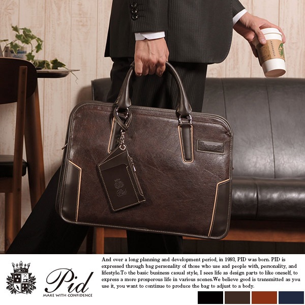 本革のようなシワ感が見事なフェイクレザーを使用した、Pid ONESTO ブリーフケース。異素材のパイピング、ハンドルで彩られ、洗練されたお洒落な雰囲気を持つビジネスバッグです。付属のストラップを使えばショルダーバッグとしても使用可能。芯材が入った自立するスクエアボディが魅力的。ビジネスシーンで大活躍するB4サイズのメイン収納、内装には小物ポケットも装備。本体前後には両あおりポケットも搭載し、ロゴ入りのパスケースも付属した抜かりのない仕立てです。個性に合わせて選べるブラック、チョコ、キャメル、ネイビーの4色で。センスのある大人の男に似合うメンズビジネスバッグです。 |