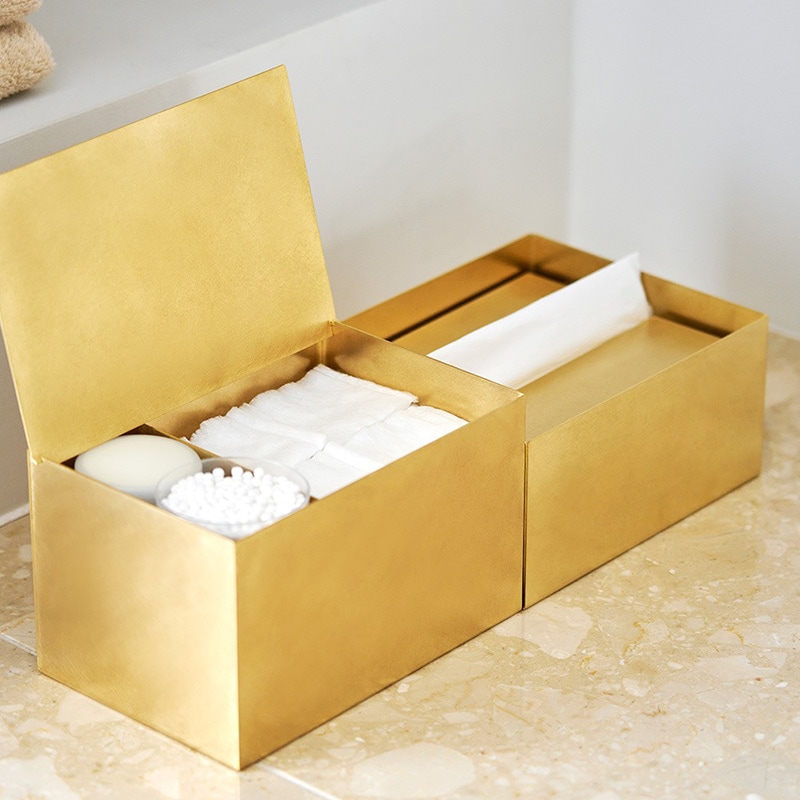 空間を選ばず置けるミニマルデザインのティッシュケース 溶接加工を一切施さず、精密板金加工による曲げのみで成形された「Ori」シリーズのティッシュケースのハーフサイズ。素材それぞれの弾性などの特性を計算し、寸法や曲げを0.1mm単位で調整。精密板金だからこそできる、シンプルで美しい形状が特徴です。場所をとらずムダなく使えることで人気のハーフサイズティッシュのためのケース。卓上や洗面台などに置いても美しく調和します。