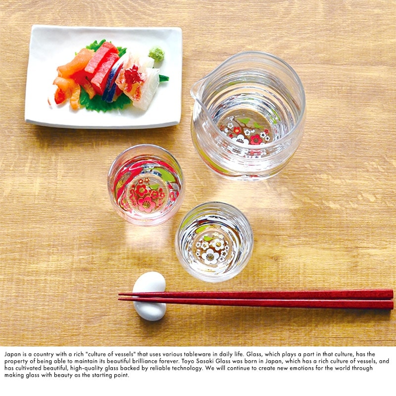 酒グラスコレクション 日本酒器3点セット 片口1個+盃2個 底面紅白梅柄 日本製 おしゃれ お祝い 結婚 新築