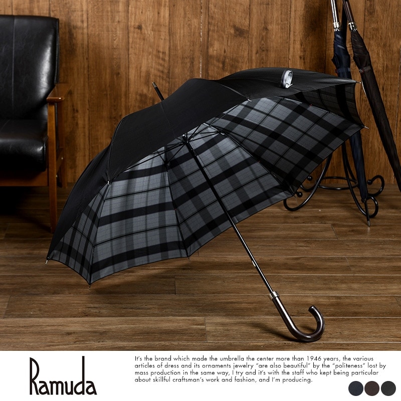 Ramuda 長傘 晴雨兼用 8本骨 65cm 日本製 チェック裏地 楓手元 おしゃれ日本 国産/雨傘 通勤/ビジネス シンプル/