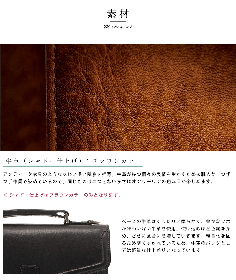 クラシカルなシャドーが印象的な牛革ショルダーバッグ。人間の肌に個性があるように、牛革にも個性があり、職人がその個性を一つ一つ見極めて最適な部位を選択し、一つ一つ特殊染料でシャドーをかけた逸品。膨大な手間と時間をかけて作られたこのバッグは、同じ表情は一つとしてない、まさしくオンリーワンのアイテムです。貴重品を持ち歩くのに便利なコンパクトサイズながら、小物ポケットなど、内部の収納も使いやすい仕上がり。付属のストラップを取り付ければ肩掛けショルダーとしても使える2WAY仕様。過不足のない洗練された機能性で、使い勝手も秀逸です。使い込まれたアンティーク家具のような、深みのあるブラウン。手に取ってみたいという衝動に駆られる、不思議な魅力が宿った国産ショルダーバッグです。