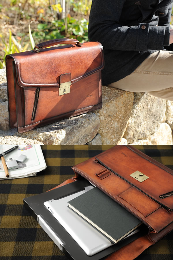 日に焼けたようなシャドーが目を引く、クラシック感あふれる国産ブリーフケース。厳選された牛革に職人が一つ一つシャドーをかけた、珠玉の逸品です。A4ファイルが収納できつつ、重たくならないスリムなシルエット。ペン差しやカード入れなど、バリエーション豊かな小物ポケットを装備しており、整頓力もかなり高めです。アンティーク家具のような深みを帯びたサンバースト・ブラウンカラー。ビジネスにもカジュアルにも馴染む、格調高いメンズバッグです。 |