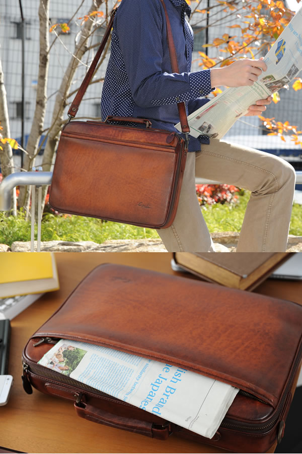 日に焼けたようなヴィンテージ調のシャドーが目を引くブリーフケース。厳選された牛革に職人が一つ一つシャドーをかけた、珠玉の逸品です。B4の書類も収納できる大きめサイズ。大小バリエーション豊かなポケットを装備しているので、整頓力もかなり高め。付属のストラップを付ければ肩掛けショルダーとしても使える2WAY仕様です。アンティーク家具のような深みを帯びたサンバースト・ブラウンカラーは、言葉では語りつくせない味わい。一生付き合えるハイセンスな国産ビジネスバッグを、是非その手に。 |