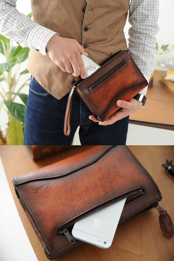 日に焼けたようなシャドーが目を引く、コンパクトな国産セカンドバッグ。厳選された牛革レザーに職人が一つ一つシャドーをかけ、クラシック感あふれる表情に仕上げた珠玉の逸品です。財布、携帯電話、ペン類、タバコなどにちょうどのコンパクトタイプ。背面にはベルトループが付いているので、ウエストバッグのようにも使えます。アンティーク家具のような深みを帯びたサンバースト・ブラウンカラー。人生を充実させる、味わい深いメンズバッグです。 |