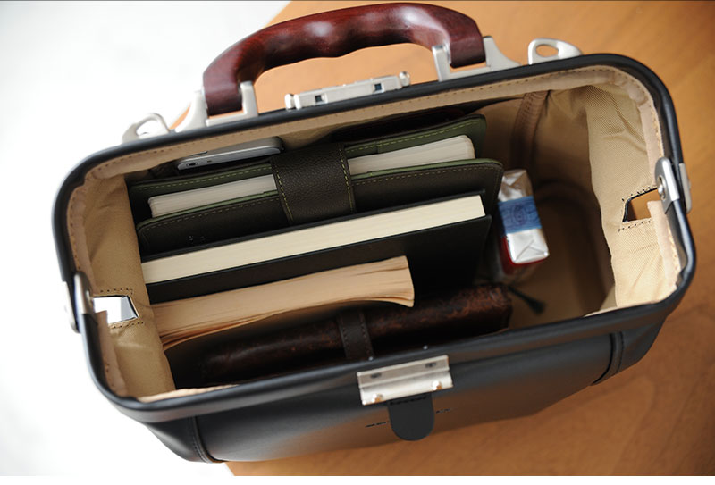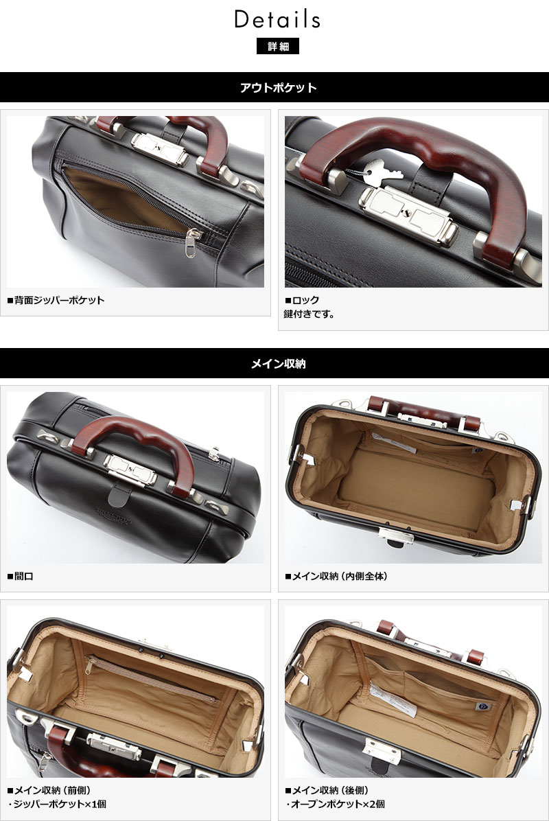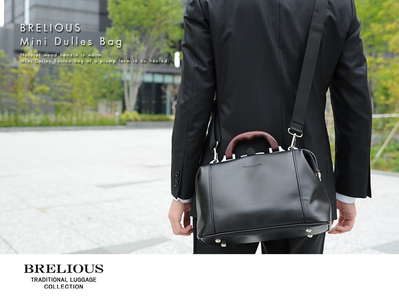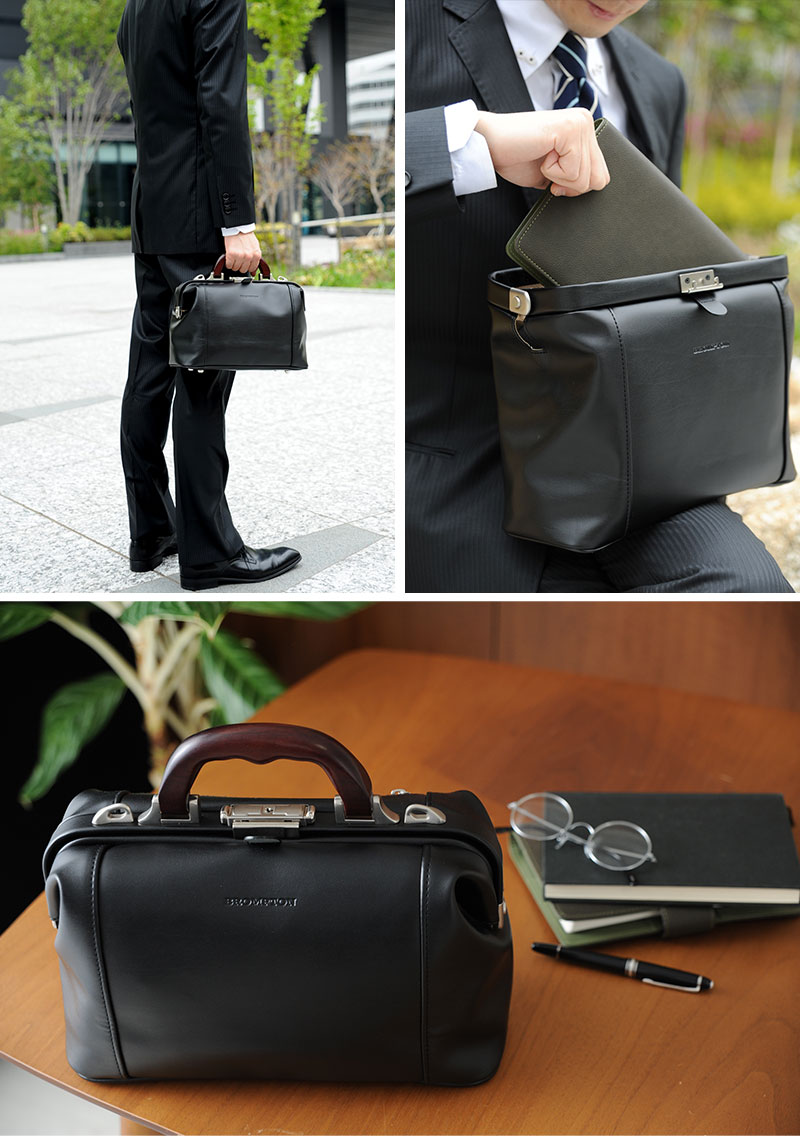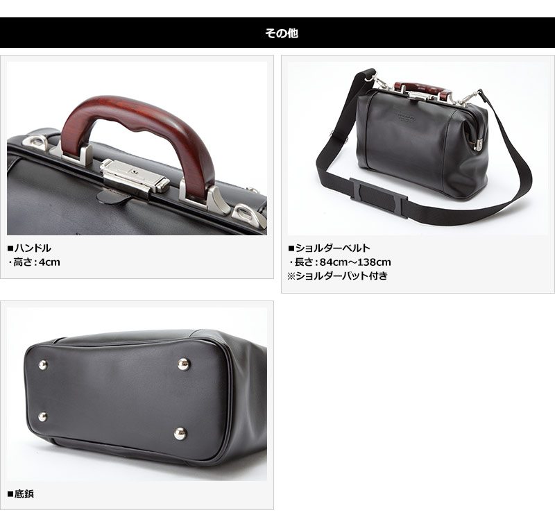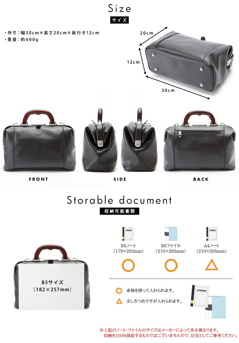 天然木のハンドルが温かい雰囲気の兵庫県豊岡産のダレスボストンバッグ。レトロながま口開閉のぽっくりとしたシルエットが愛らしいミニボストンバッグで、B5サイズの書類も簡単に出し入れが出来ます。またメイン収納内の小物ポケット、背面ポケットなどの小物収納も便利です。ショルダーバッグとしても活躍するストラップ付き。トラッドな印象のブラックで。国産で大事に持ち歩きたいメンズバッグです。