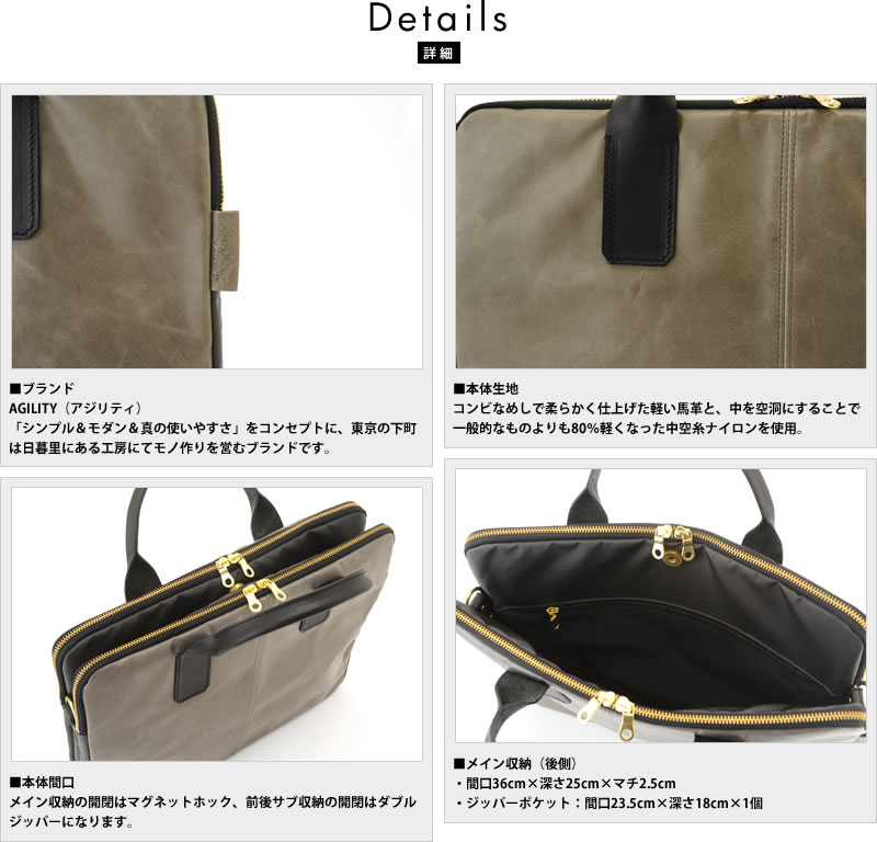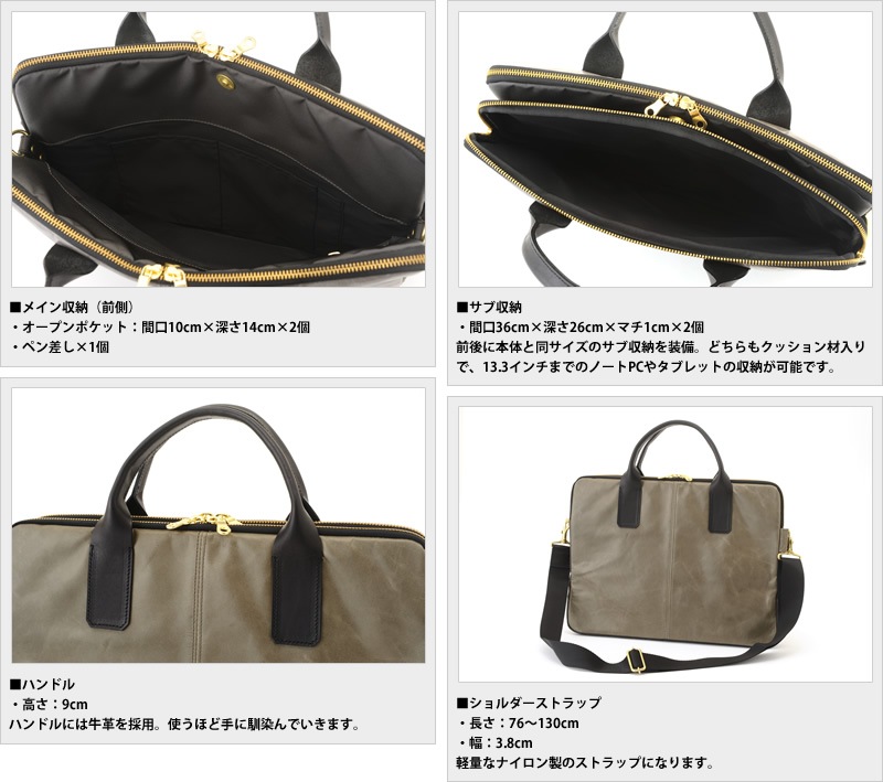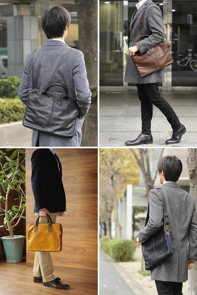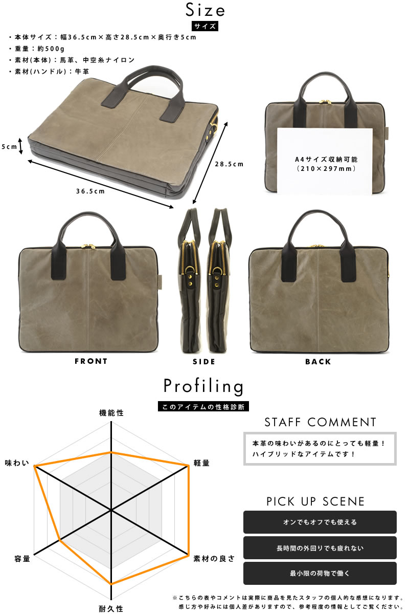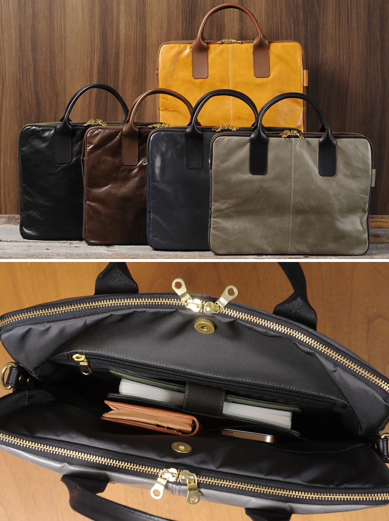 デジタル化に伴い荷物が少なくなった、現代のビジネスマンに最適なビジネスバッグ。軽量な馬革とナイロンを適材適所で使い分け、ルックスは味わい深い本革、重量はナイロンクラスと、双方のいいとこ取りを実現しています。全体のマチもかなり薄めに作られているので、身軽な通勤・外回りを叶えてくれることでしょう。A4ファイルが収められる収納を3部屋備え、書類やノートPCはもちろん、財布やスマホといった小物の整理もお手のもの。付属のショルダーストラップを取り付ければ、荷物が多いときや自転車の際も快適に使えます。
