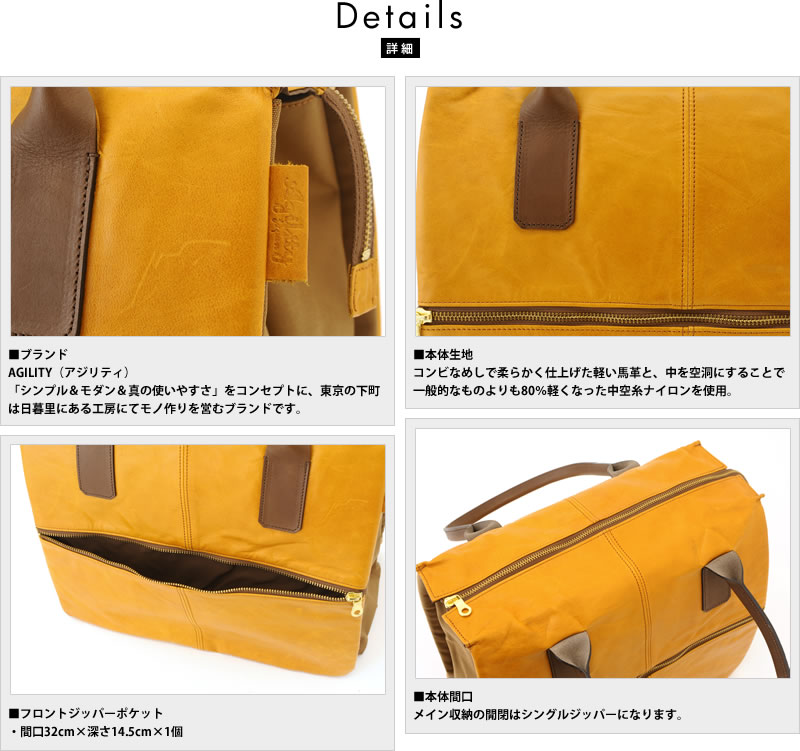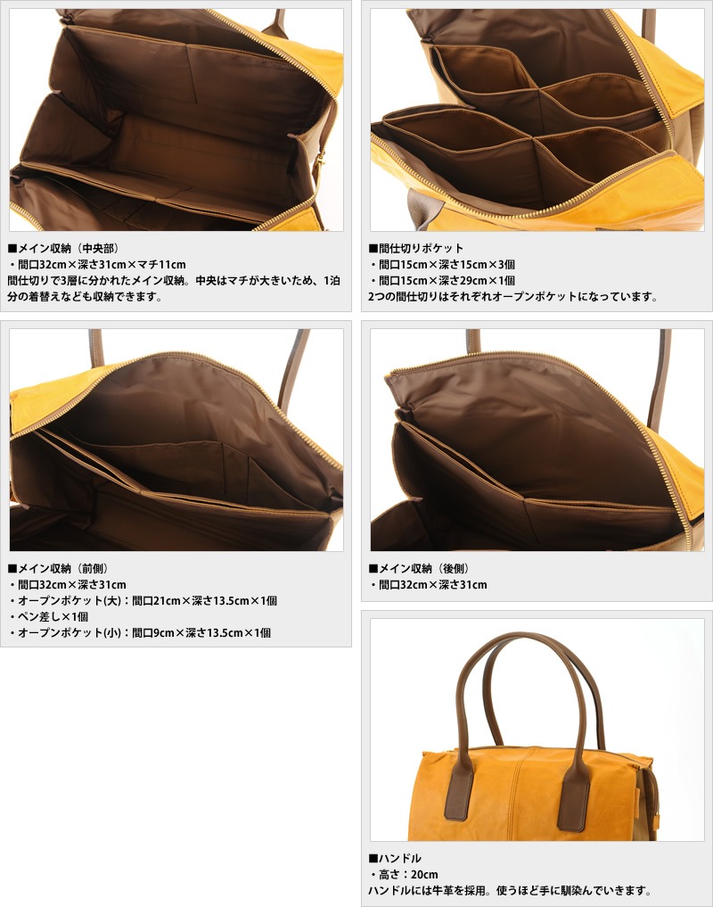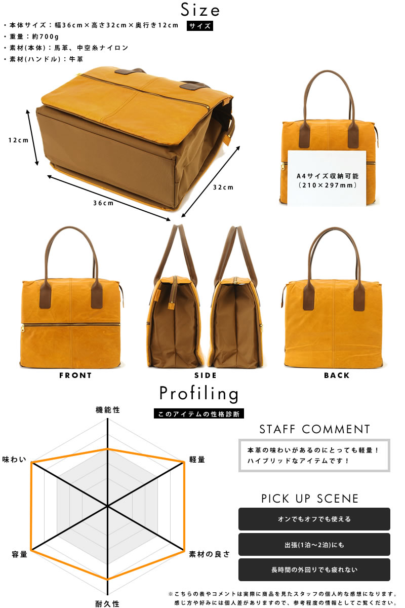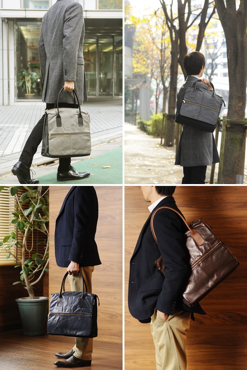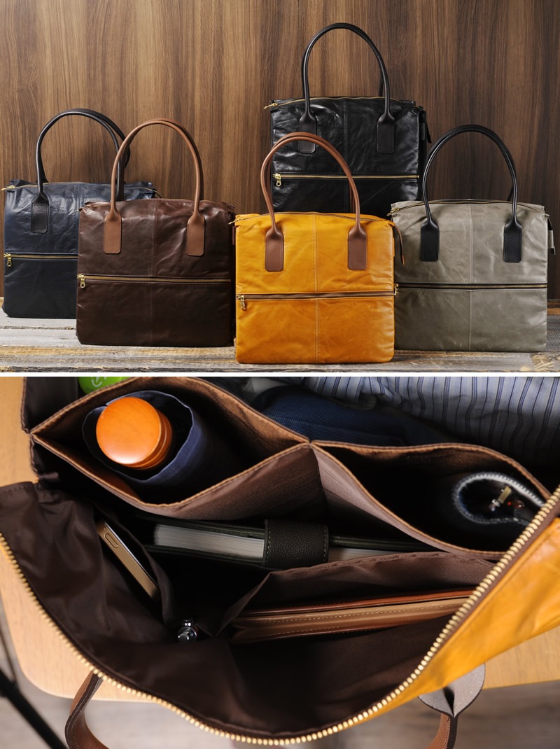 軽量な馬革とナイロンを適材適所で使い分け、ルックスは味わい深い本革、重量はナイロンクラスと、双方のいいとこ取りを実現したトートバッグ。メイン収納は中で3層に分かれ、A4ファイルや13.3インチのノートPCに対応。中央のメイン収納はマチがかなり大きめに作られ、ビジネスだけでなく1泊旅行、スポーツジム、ゴルフなど、幅広い用途で使えます。2つの間仕切り部分もオープンポケットになっていたりと沢山の収納があり、小物類の仕分けもお手のもの。荷物をたくさん入れたい方や、ひとつのバッグをオンにもオフにも使い回したい方に最適なトートバッグです。