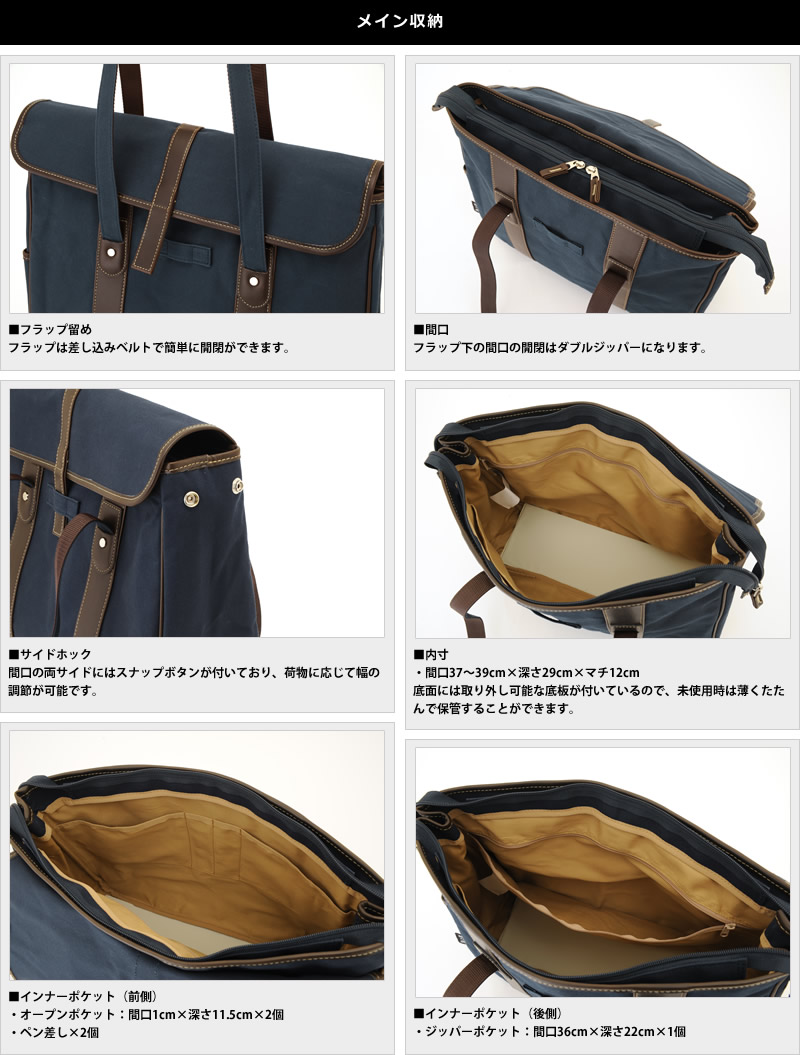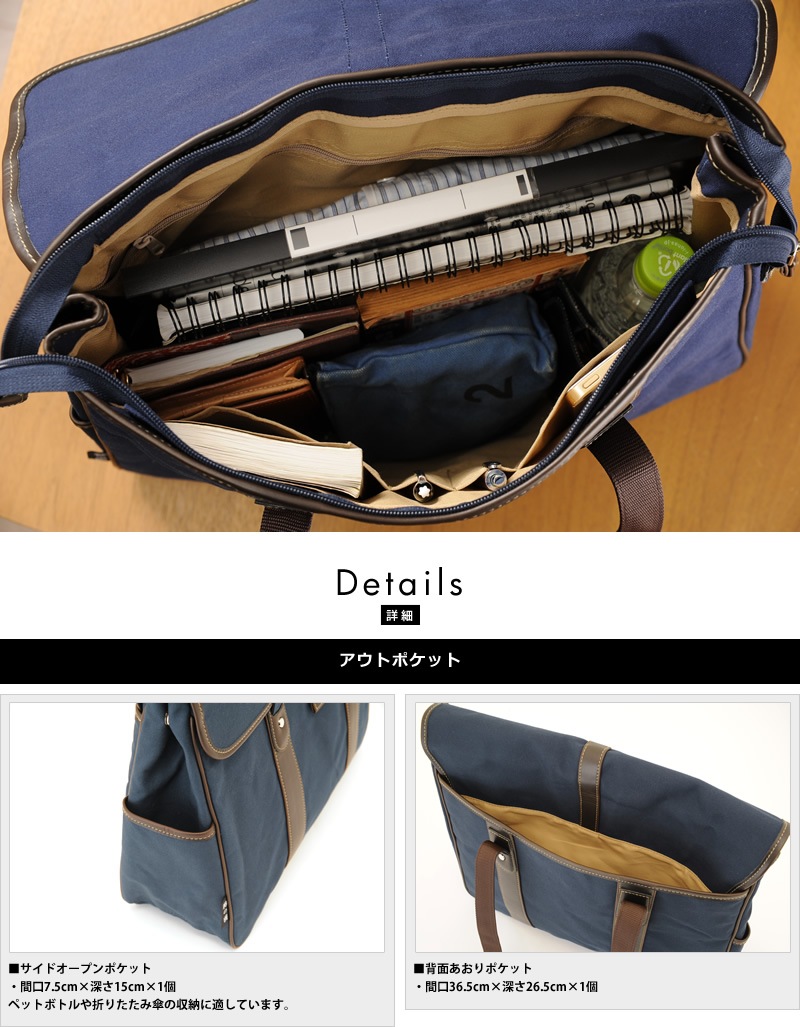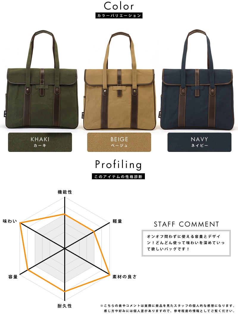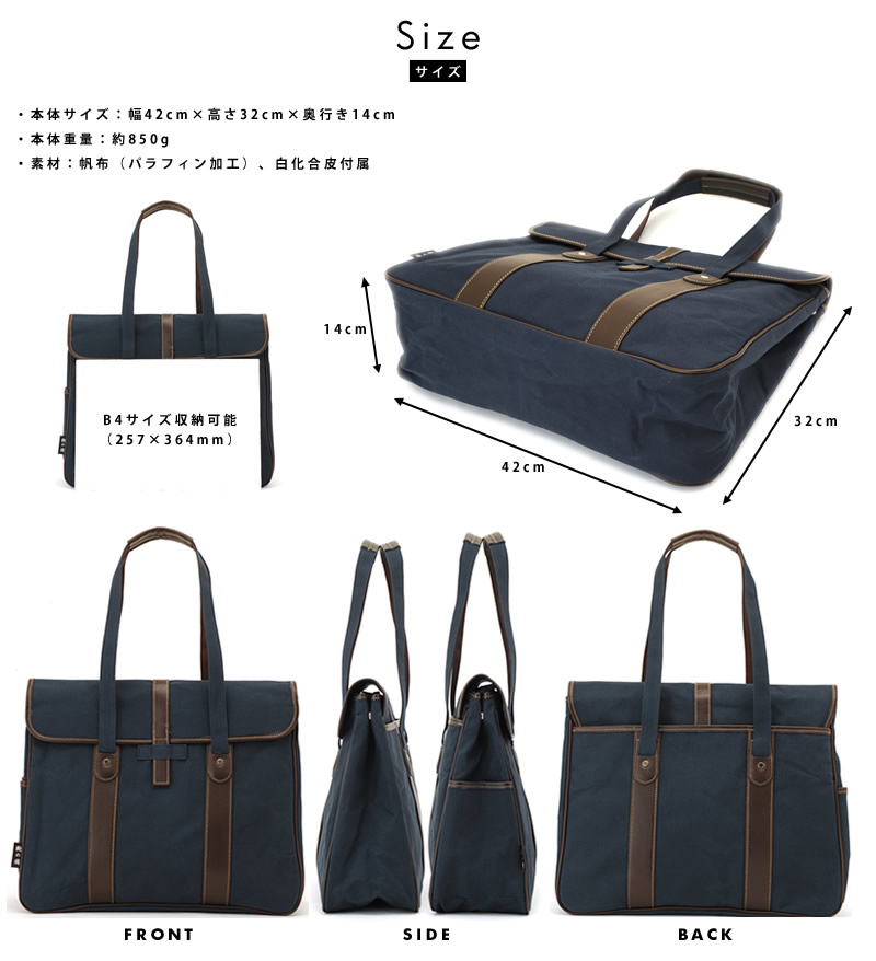 古き良き日本の雰囲気が漂う、クラシックな顔立ち。プライベートでもビジネスシーンでも使える、大人カジュアルなトートバッグです。素材には、ロウ引き加工を施したパラフィン帆布を使用。帆布の強度と撥水性を高め、ハリのあるしっかりとした質感が特徴です。使い込むうちに白化し、穿き込んだデニムのように味わいを深めていくのも醍醐味。付属にはアンティークな風合いのある白化合皮を組み合わせ、カブセデザインと相まってクラシックな雰囲気を高めています。メイン収納はビジネスシーンでも問題なく使用できるB4対応サイズ。新聞がさっと収納できるあおりポケットや、ペットボトルなどが収納できるサイドポケットなど、小物ポケットも充実。1泊程度の小旅行もこなせる容量なので、幅広いシーンで愛用することができます。