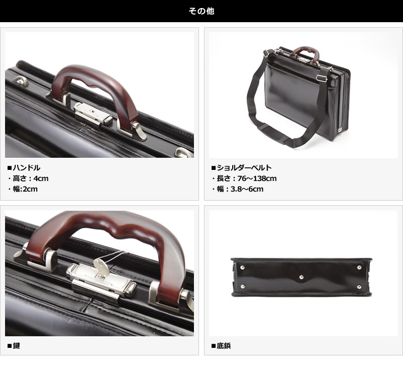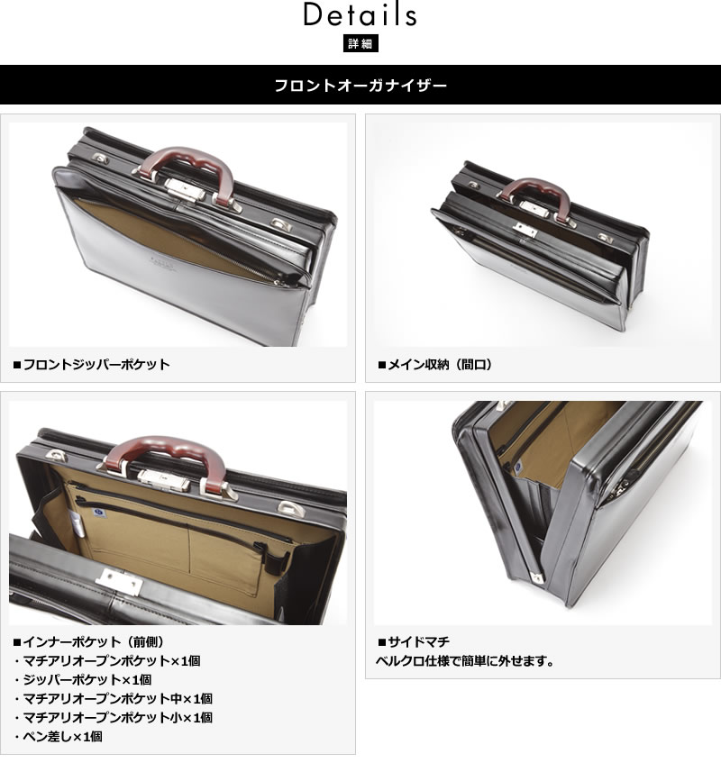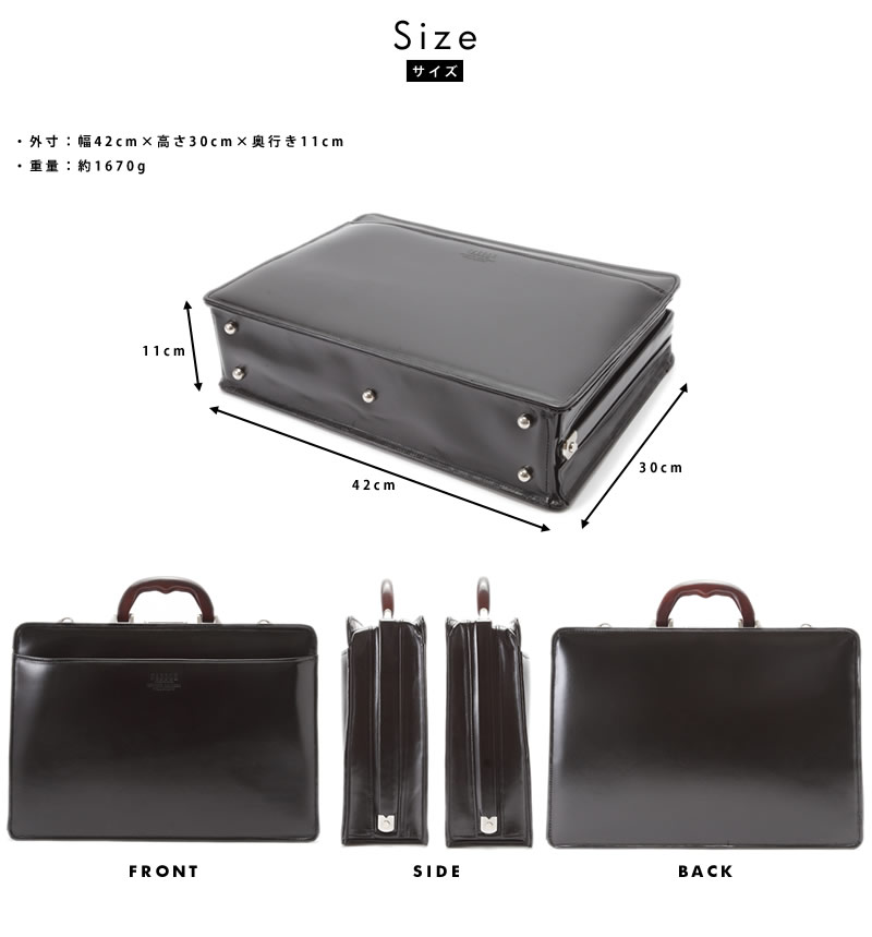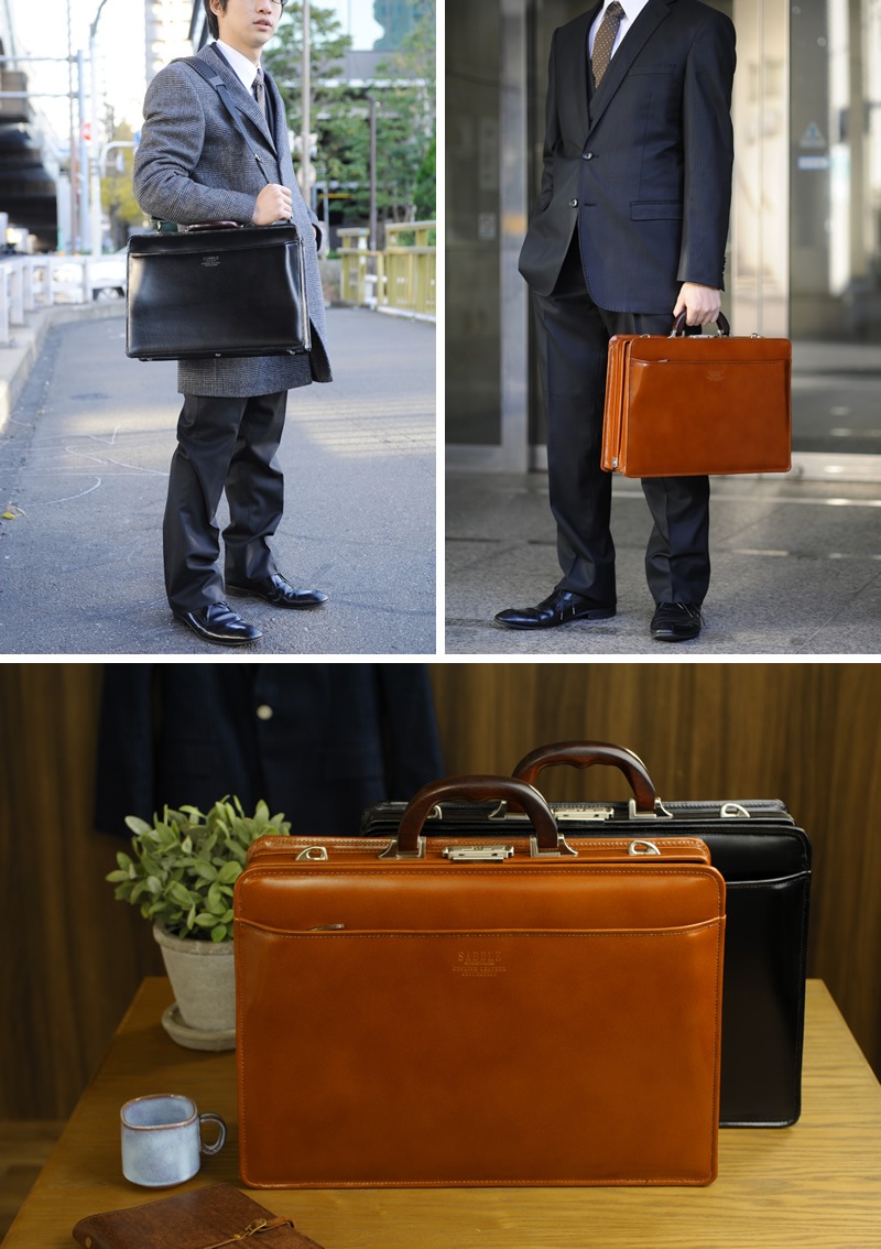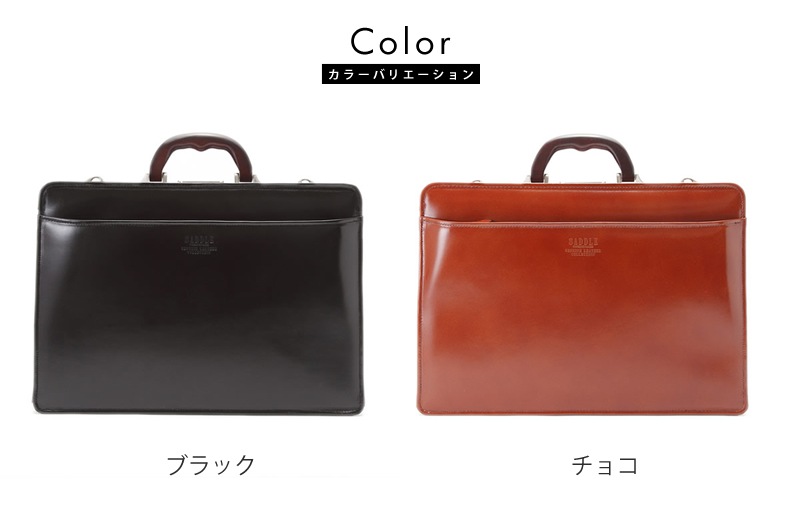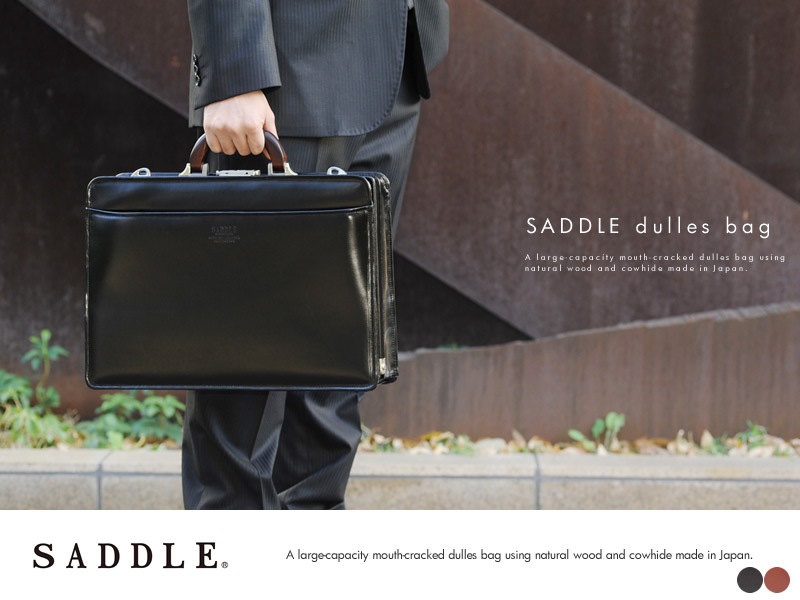 日本製の天然木と牛革を使った大容量の口割れダレスバッグ。
