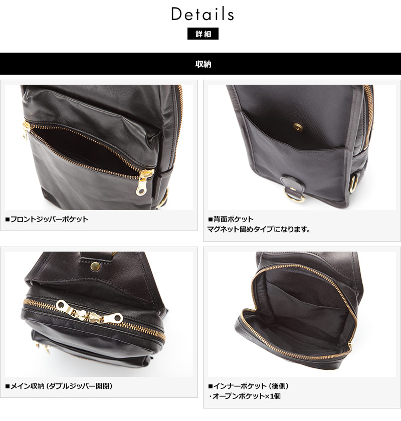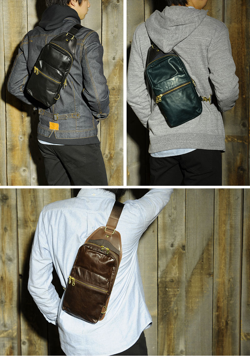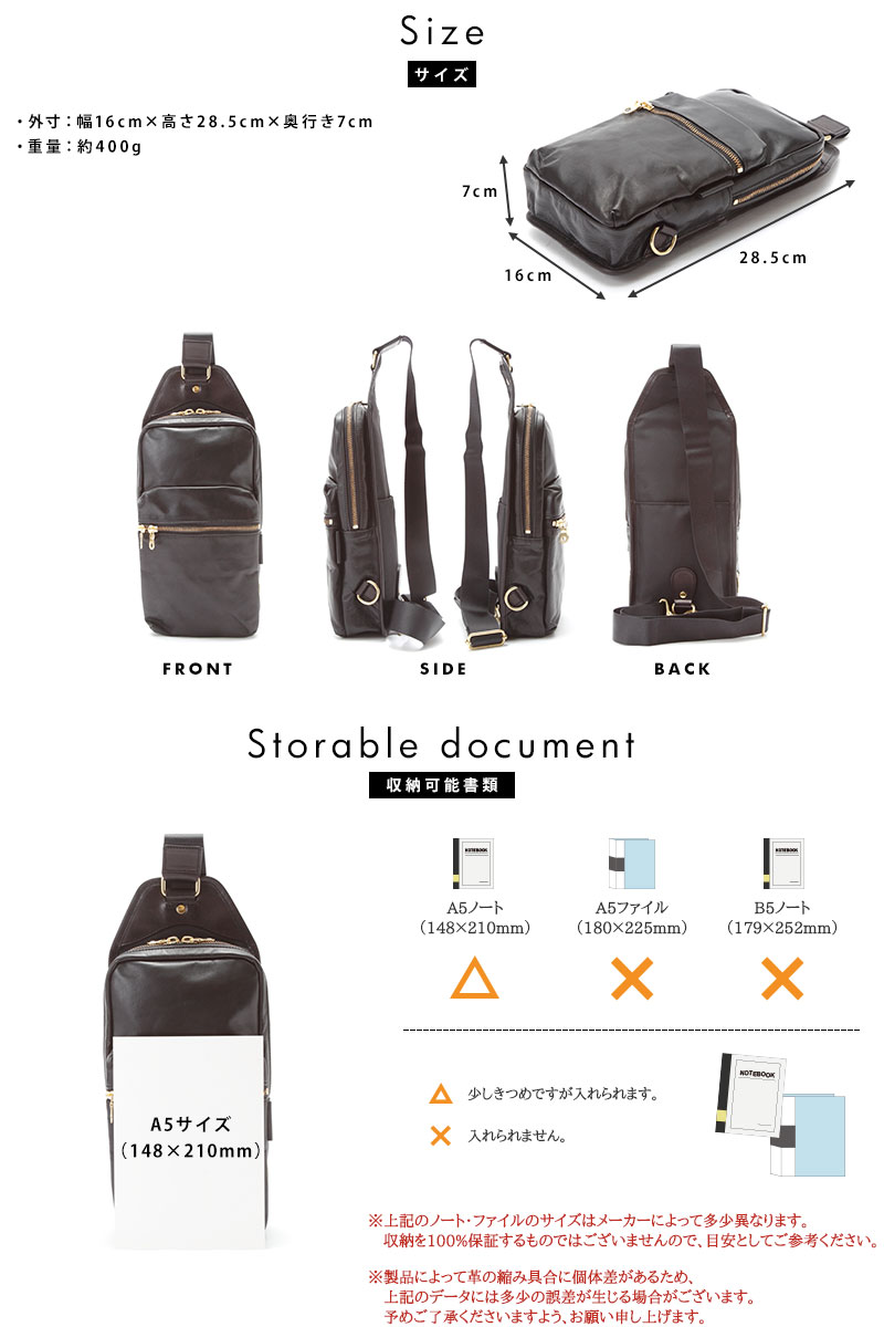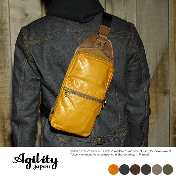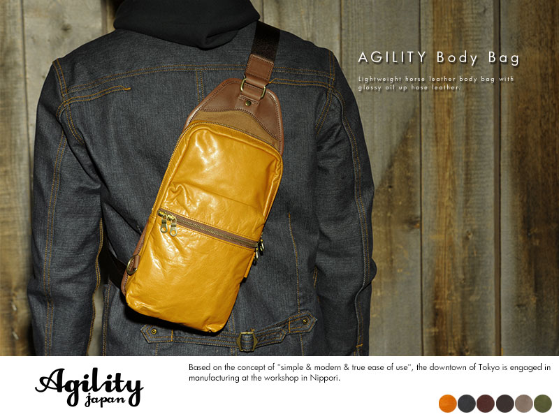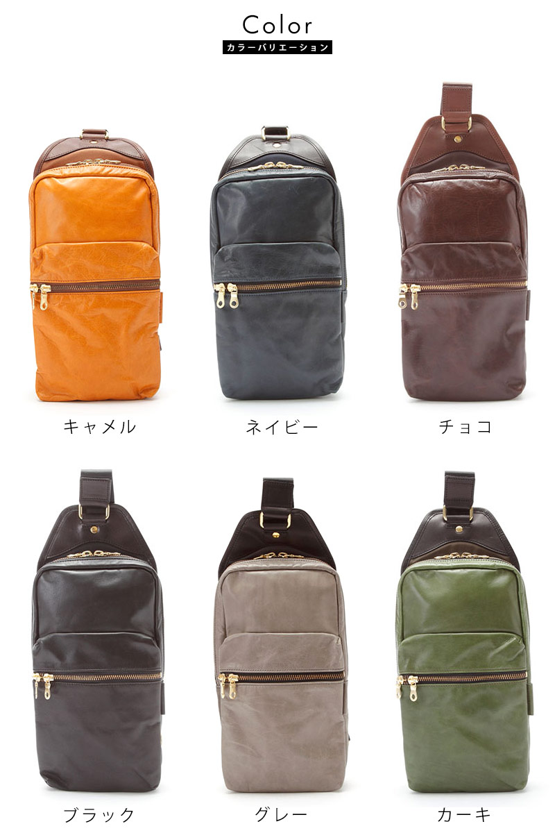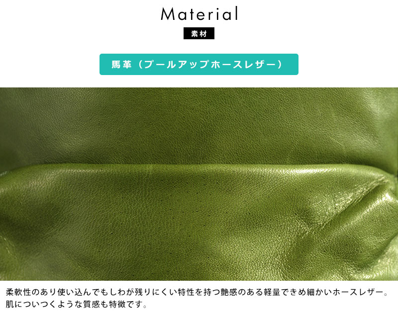 艶のあるオイルアップホースレザーを使用した軽量な馬革ボディバッグ。