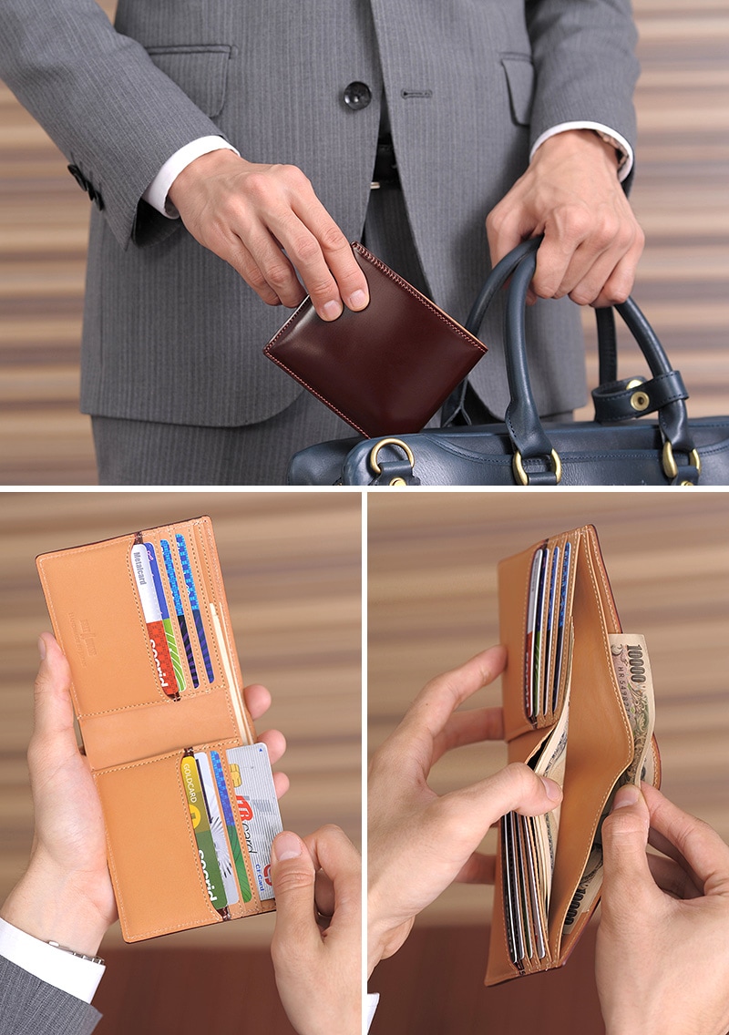 硬質でハリのあるコードバンを使用した二つ折り札入れ。艶のある美しさと強靭さを兼備した革質が魅力です。二つ折りのスリムな本体は札入れ×2、カード入れ×8、収納スペース×2、とオーソドックスな純札仕立て。内装には牛革ヌメを採用しています。オンにオフに、様々な場面にしっくり馴染む財布の王様、コードバンの純札財布。大切な方へのプレゼントにも喜んでいただける革小物です。