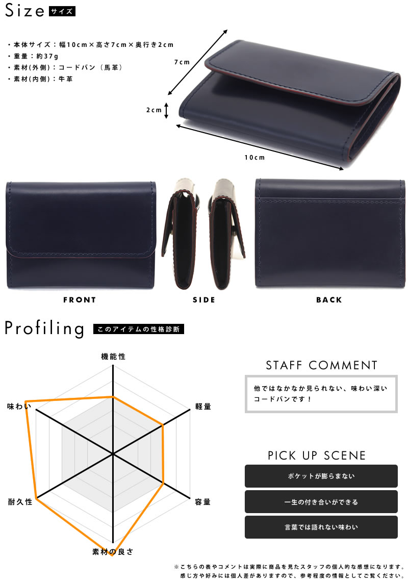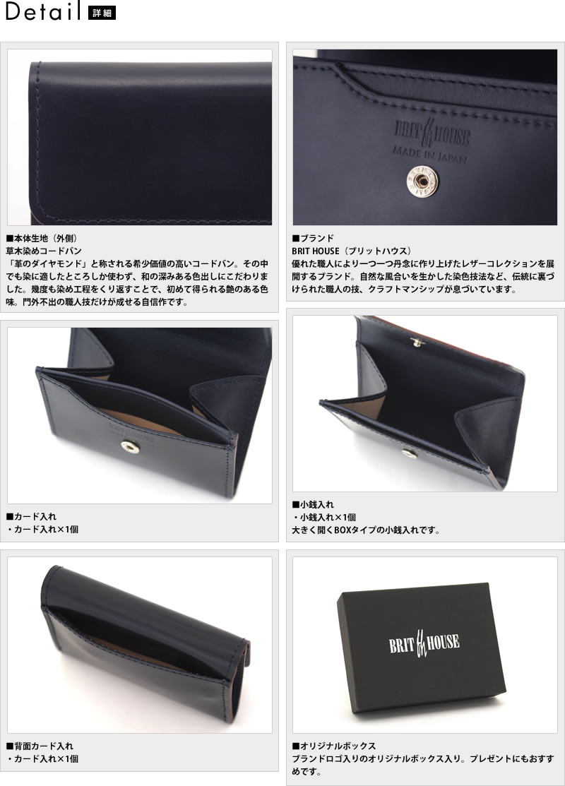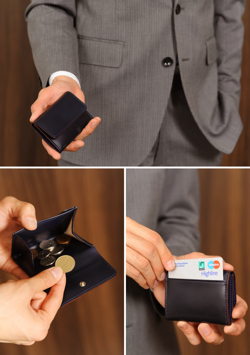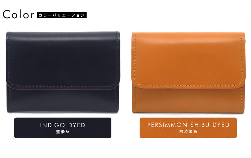 「革のダイヤモンド」と称されるコードバンに日本伝統の染色を施した、味わい深い草木染めコードバン。通常のコードバンは一点の曇りもない滑らかな表情をしていますが、この草木染めコードバンは色ムラがあり、使い込むうちにより色の深みを増していくのが特徴です。ただでさえ希少価値の高いコードバンの中から染めに適した箇所を厳選し、幾度も染め工程をくり返して初めて得られる、味わい深いコードバンです。海外で“ジャパニーズ・アイ”と呼ばれる濃紺色「藍染め」、古くから庶民の生活の中で日常的に用いられてきた「柿渋染め」の2色を展開。いずれも日本固有の色として有名な、和の趣ある色合いです。