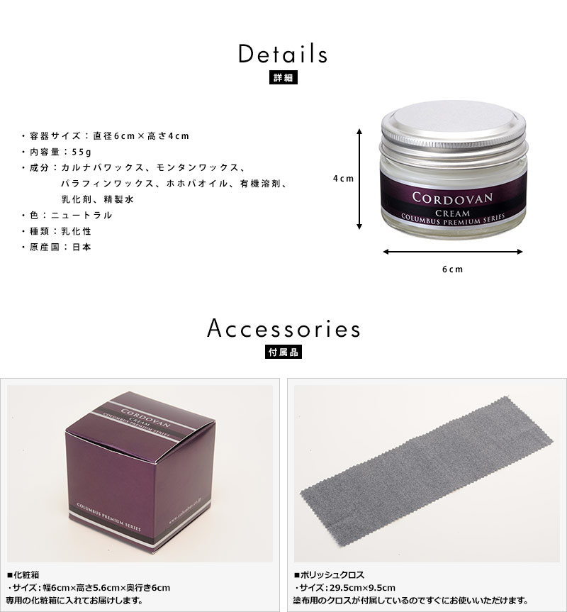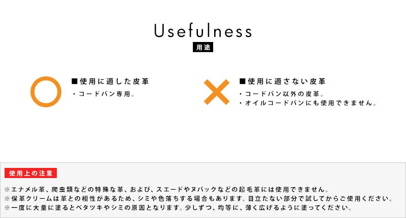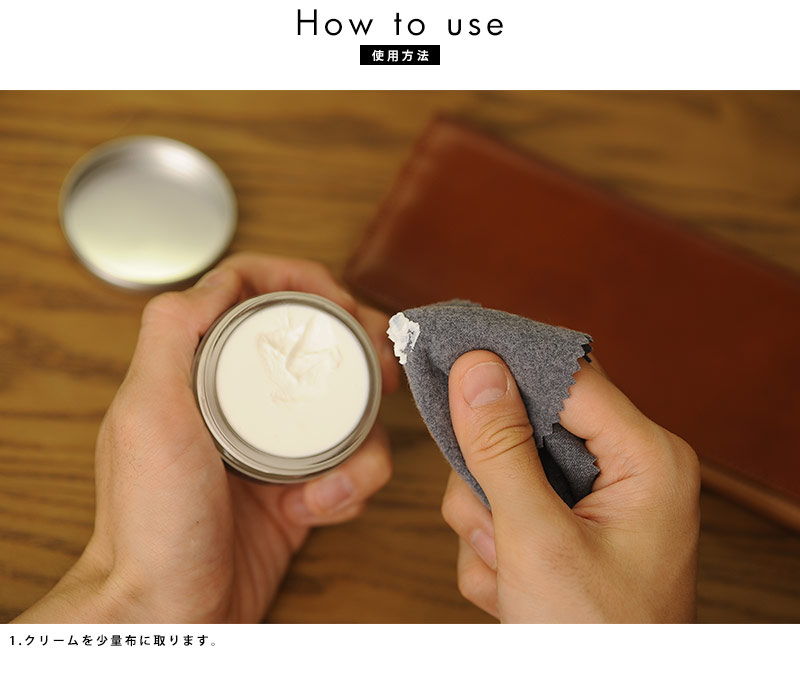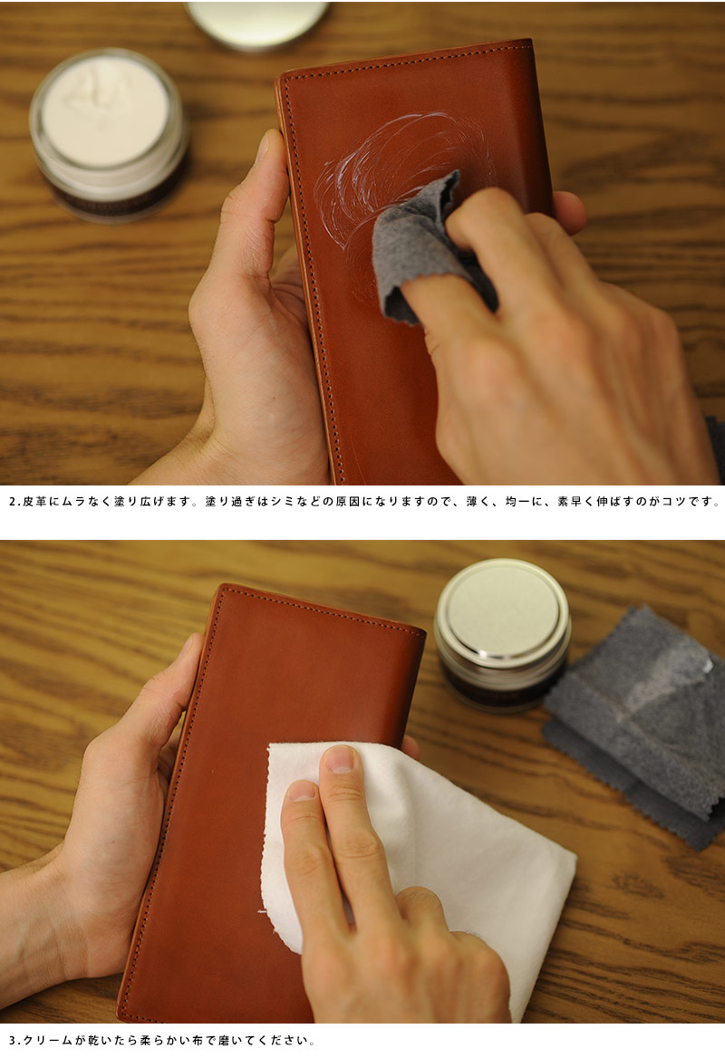 お気に入りのコードバン製品を長く美しく使うために、定期的に油分と栄養を与えてあげましょう。このクリームは「革のダイヤモンド」の異名を持つコードバンのために調合されたコードバン専用のクリーム。バッグ、革小物はもちろん、靴にもお使いいただけます。革製品は定期的にケアをすることで寿命が延び、美しさも格段にアップ。なにより、愛用品に手をかける時間はそのモノへの愛着をより一層深いものにしてくれることでしょう。塗布用のクロスが付属しているので、到着後すぐにお使いいただけます。