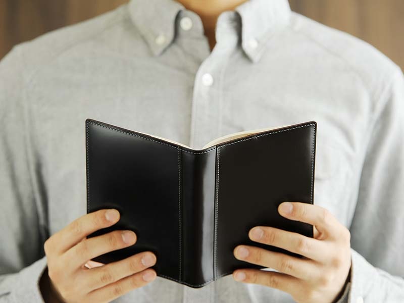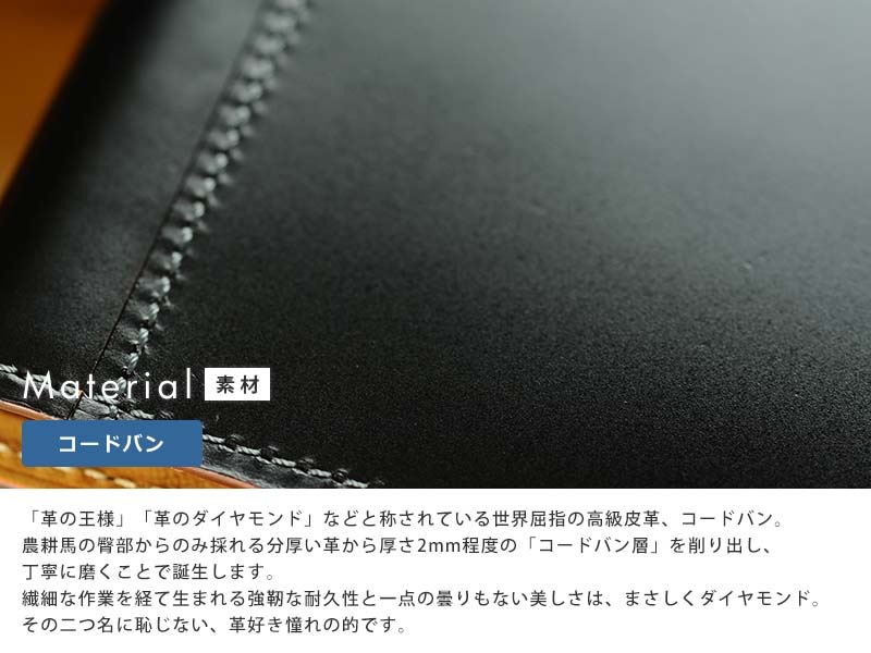 | 硬質でハリのある「革のダイヤモンド」コードバンを使用したブックカバー。大切な方へのプレゼントにも喜んでいただける革小物です。 |