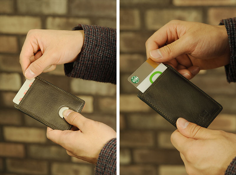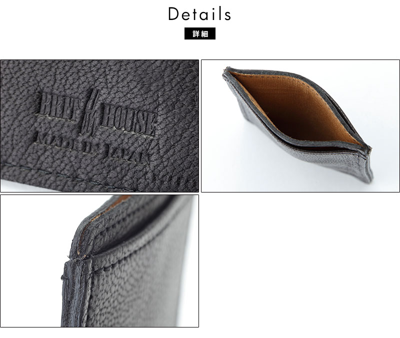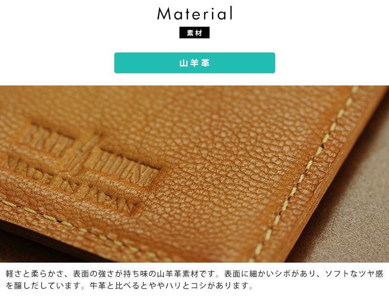 銀面(革の表面)の個性的な凹凸シボ模様と独特な毛穴の形が特長的で、薄くても強度を保てる優れた山羊革を使った日本製革製品