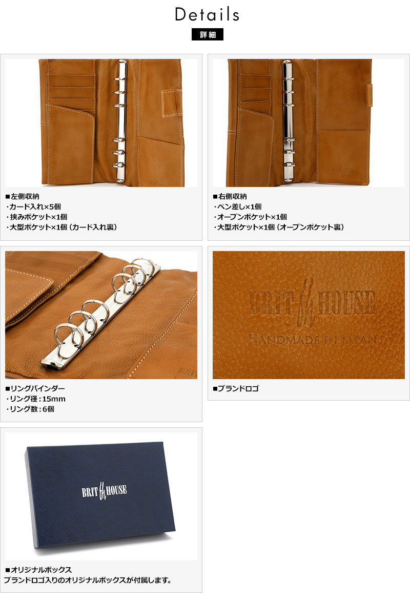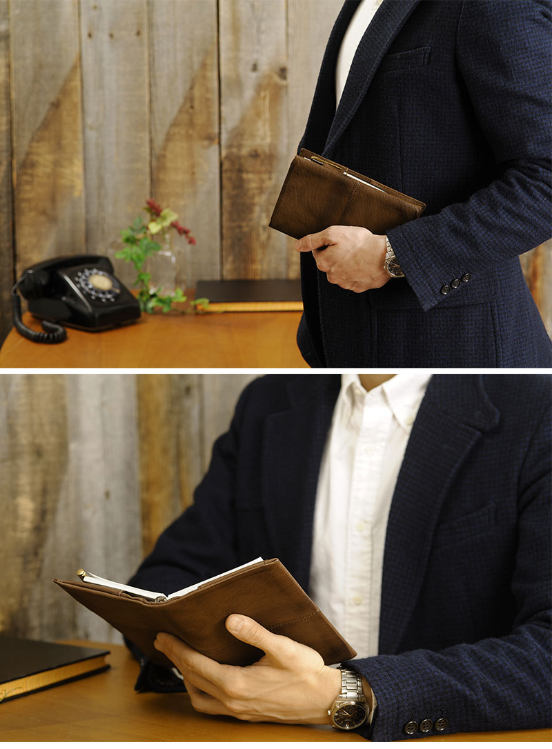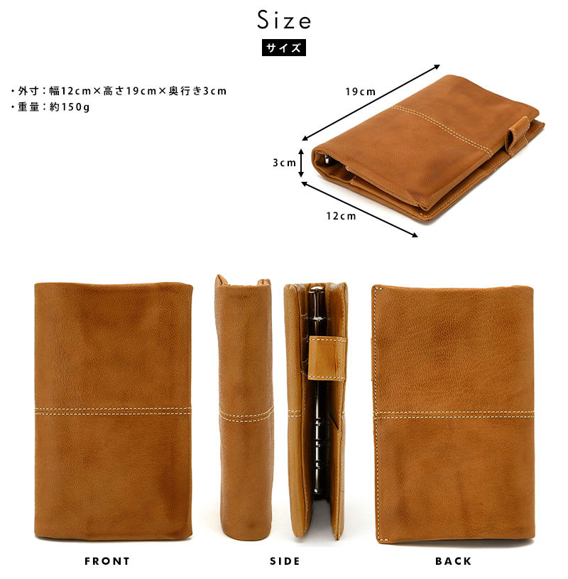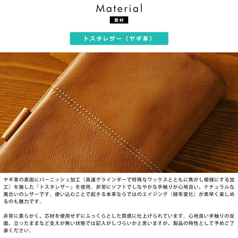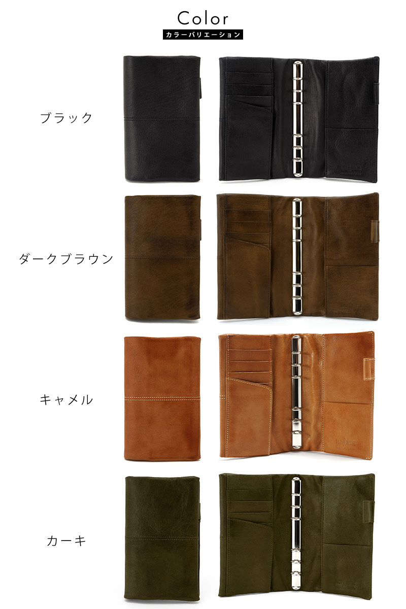 焦がし模様がアンティークな空気感を醸し出す、味わい深いシステム手帳。メイン素材にはソフトなヤギ革を使用し、その柔らかさを生かすために芯材を使用せず、ふっくらとした質感に仕上げています。ビジネス用の手帳としてはスタンダードなバイブルサイズ。携帯性に優れ、カード、ペン、メモ紙などが整理できるポケットを豊富に備え、スケジュール管理だけでなくアイディア帳としてもピッタリです。