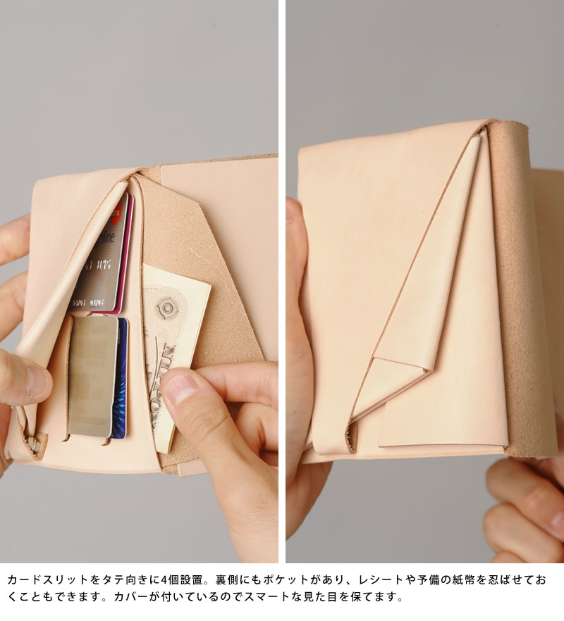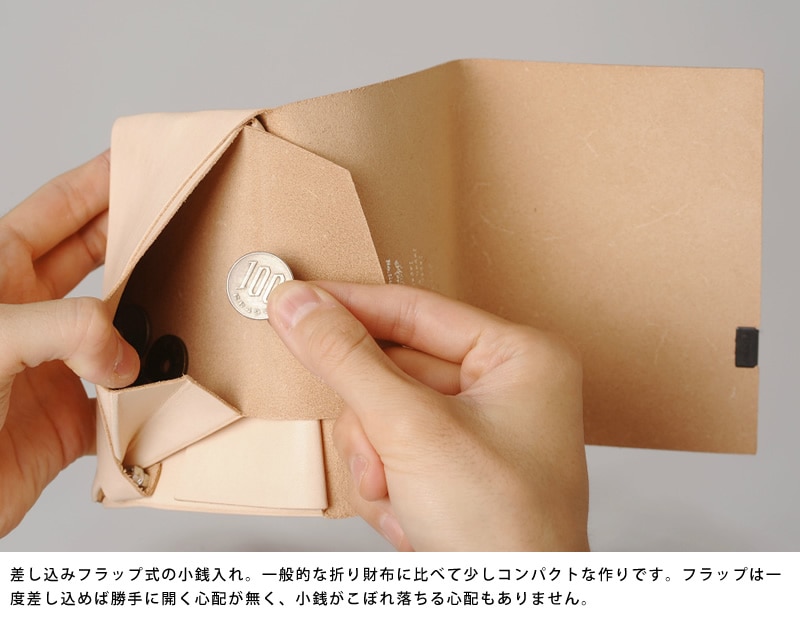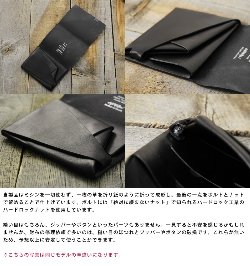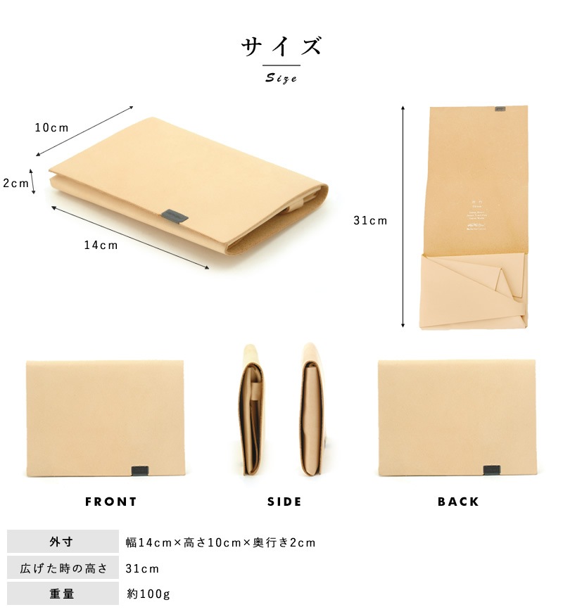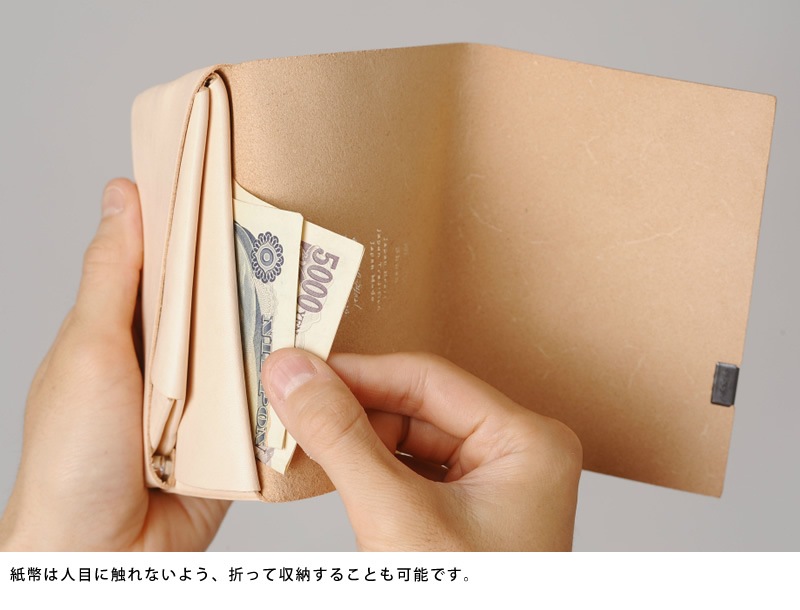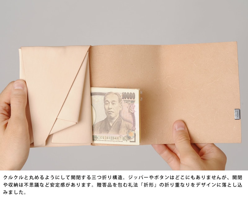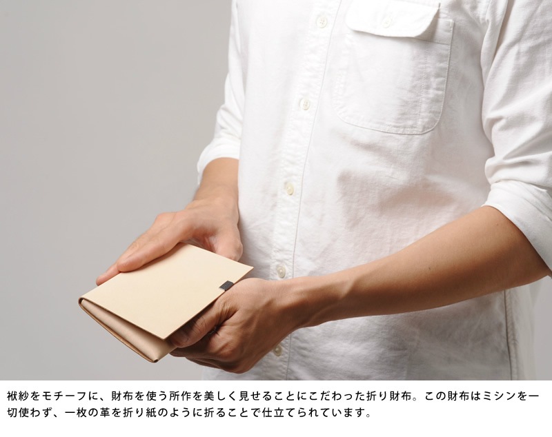 日本伝統の袱紗(ふくさ)をモチーフに、「所作の美しさ」を追求した折り財布。一枚の革を、伝統の礼法「折形」にならって折って成形し、縫い目だけでなくジッパーやボタンも無い独創的な仕立て。素材には、染色せずに革本来の肌色を引き出した姫路産の白ヌメ革を使用。表面加工も施していないため、日光や手の脂など外部の刺激を受けやすく、使うたびに自然な飴色へと変化していきます。分かりやすい和柄などを使用することなく、折り重なりから日本ならではの美意識を漂わせる、粋な折り財布です。