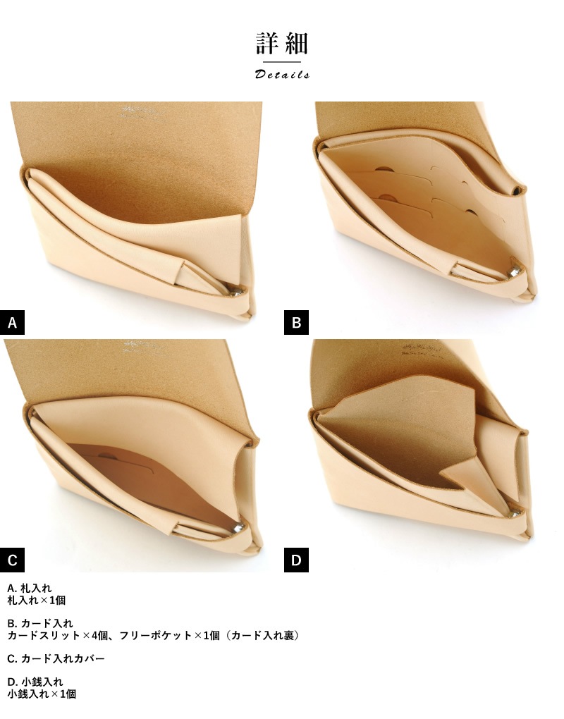 札入れ×1、小銭入れ×1、カードスリット×4、フリーポケット×1