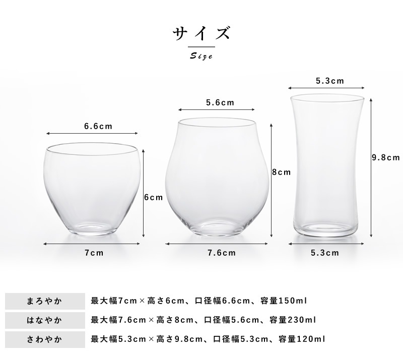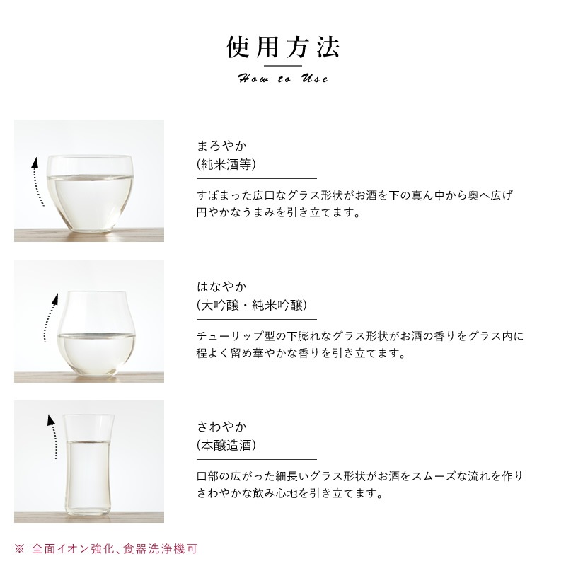 純米酒のようなおだやかな香りで甘口の酒には「まろやか」で旨味を引き立て、本醸造酒のような辛口でスッキリした酒には広口のストレート型の「さわやか」でダイレクトに味わい、香りの華やかな大吟醸や純米吟醸は下膨れの「はなやか」で香りを楽しむ。