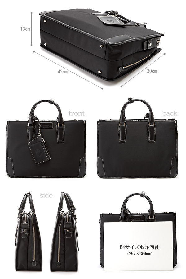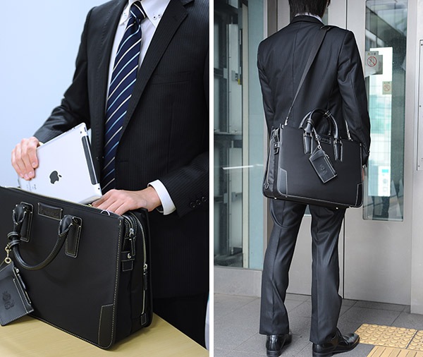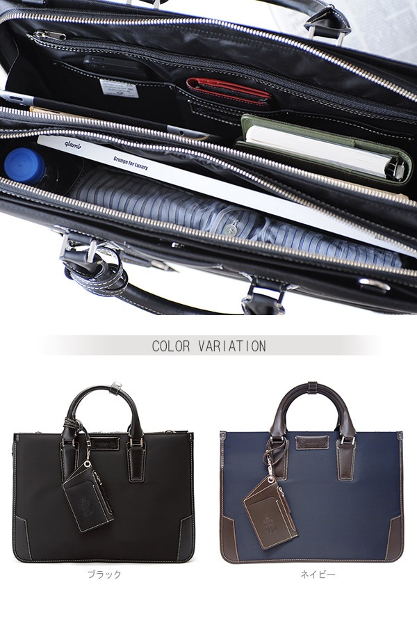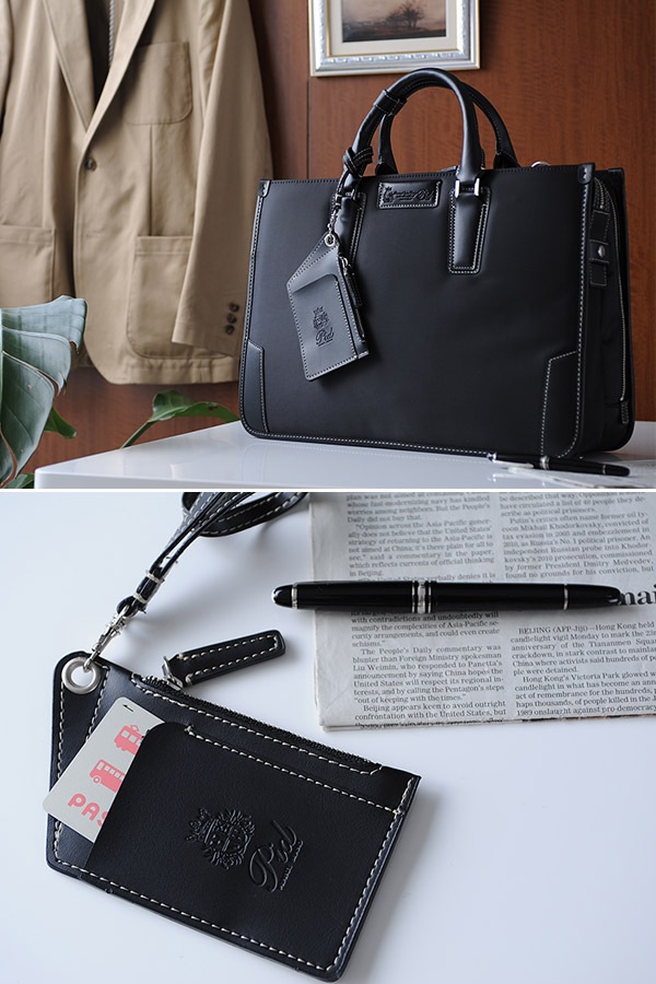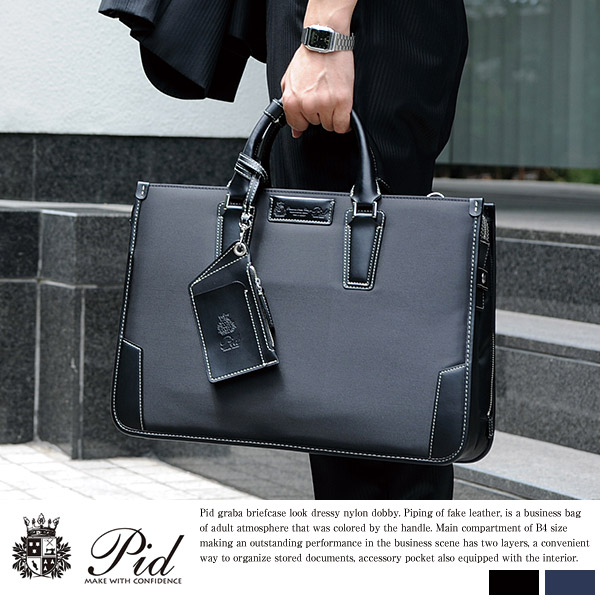 ドビー織りナイロンのドレッシーな表情のPid graba ブリーフケース。フェイクレザーのパイピング、ハンドルで彩られた大人の雰囲気のビジネスバッグです。ビジネスシーンで大活躍するB4サイズのメイン収納は2層有し、書類を整理収納するのに便利で、各内装には小物ポケットも装備。本体前側にはあおりポケットを搭載し、ロゴ入りのパスケースも付属した抜かりのない仕立てです。精悍さをイメージさせるブラック、ネイビーの2色で。センスのある大人の男に似合うメンズビジネスバッグです。 |