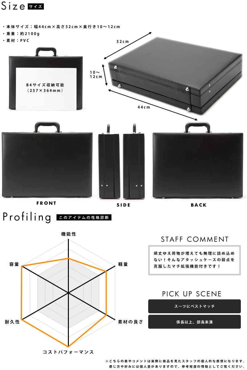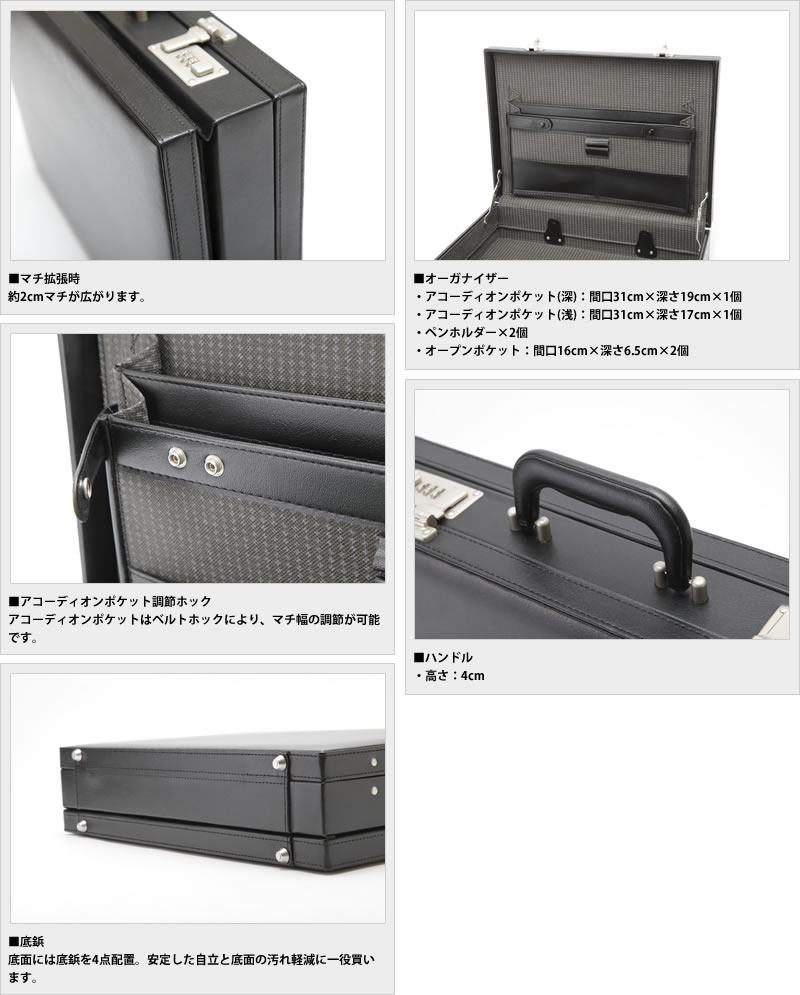 シンプルさが魅力の、洗練されたハードアタッシュケース。ダイヤルロックや頑丈な構造など、アタッシュケースに求められる最低限のスペックにエクスパンダブル(マチ拡張)機能を加えつつ、価格を抑えた非常にコストパフォーマンスの良い一品です。素材には本革のようなシワとシボが入った合皮素材を使用。雨などに濡れても拭くだけで大丈夫な、メンテナンスフリーな気軽さが魅力です。B4ファイルが余裕で収納できるサイズで、大量の資料も、厚手のカタログも、着替えもしっかり収納できます。ツールポケットも充実しているので小物類の整理にも困りません。急に荷物が増えても安心の、エクスパンダブルアタッシュケースです。