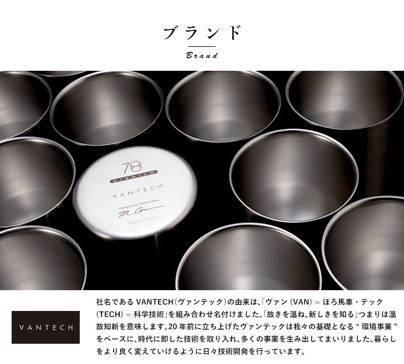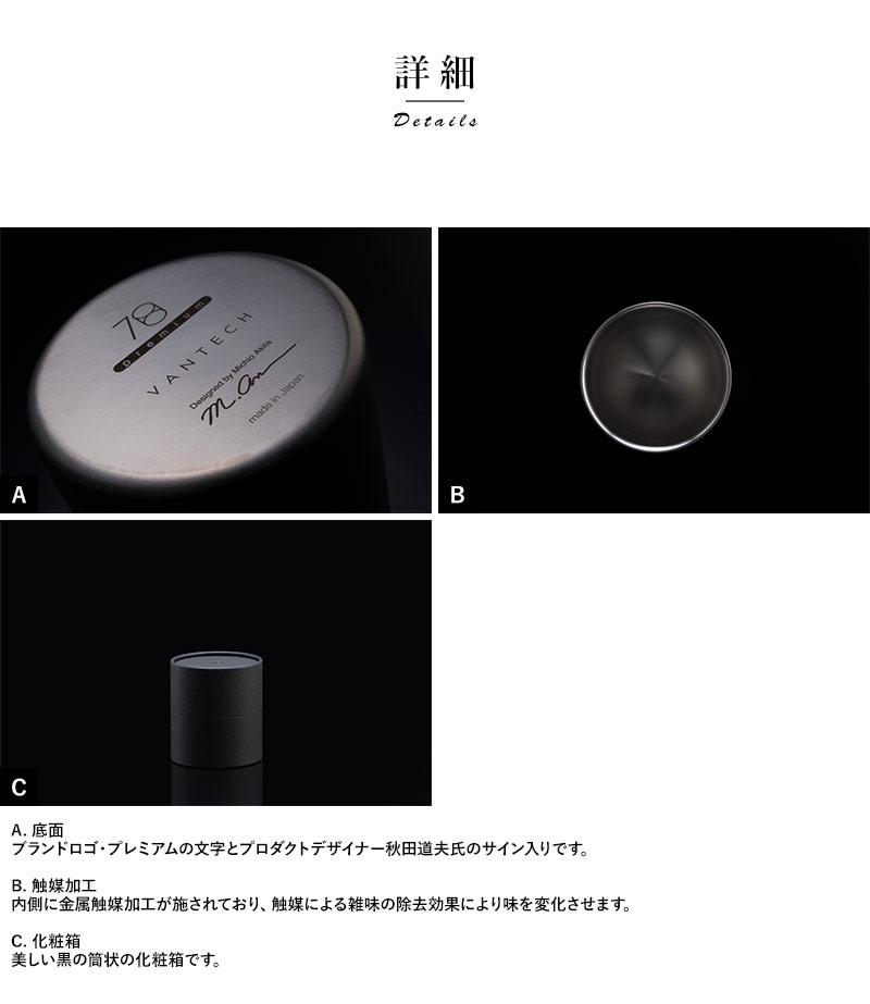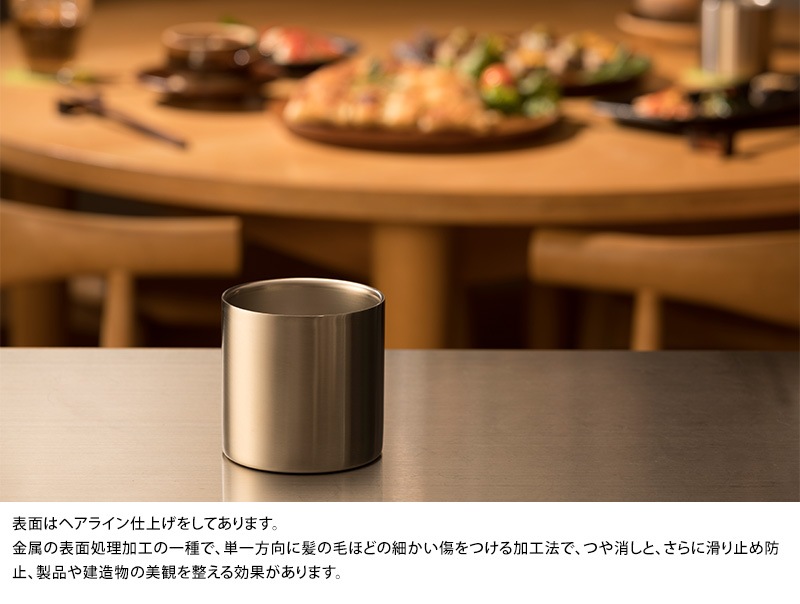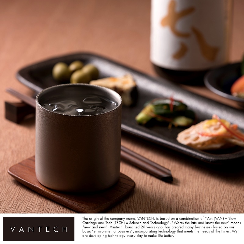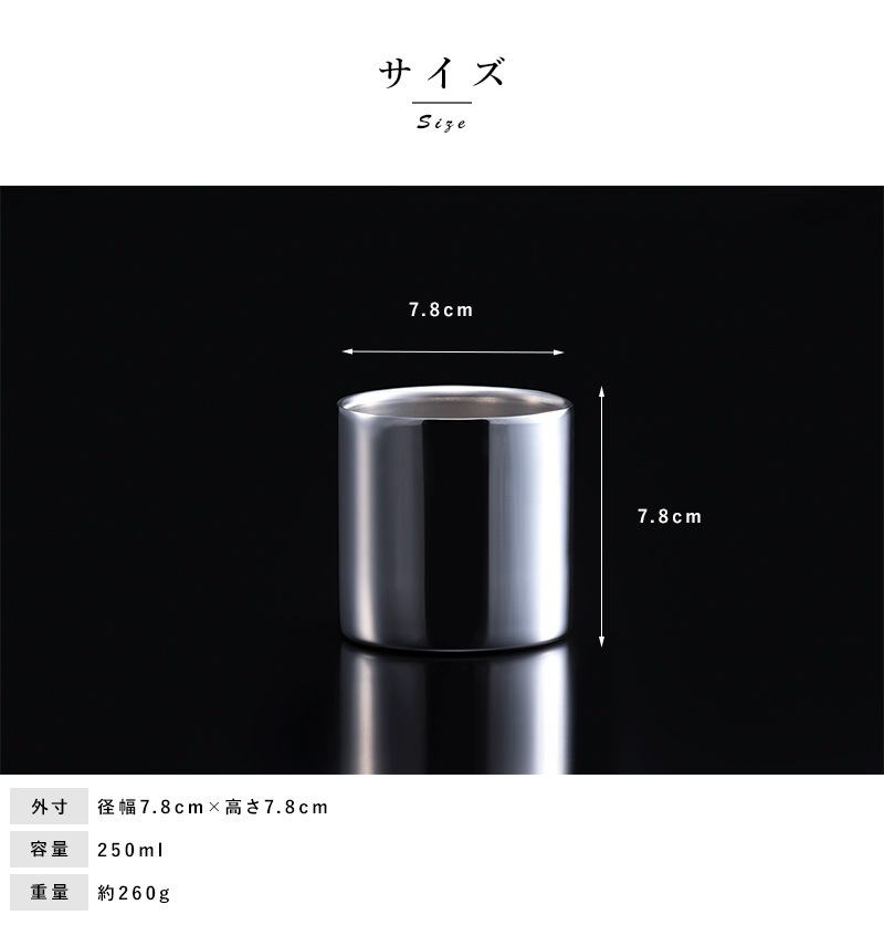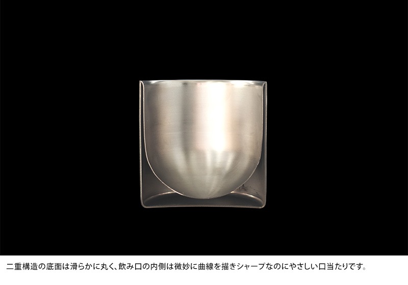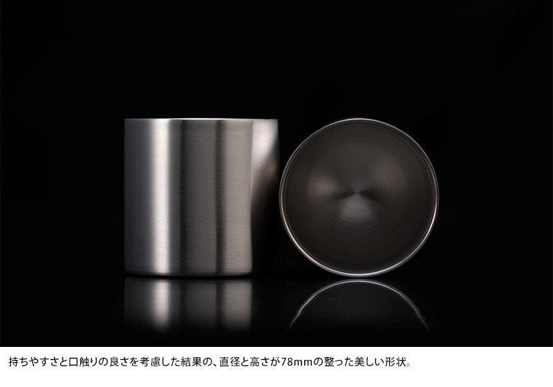 内側に金属触媒加工を施し、注ぐだけでお酒を熟成させる不思議なステンレス製ロックグラスです。手への馴染みやすさ、お酒を飲んだ時の口触りのよさを追求した結果、たどり着いた直径78mm×高さ78mmのサイズ。通常のステンレスグラスの倍にあたる1.2mm厚のステンレスを用い、満足感が芽生えつつも使いにくさを感じさせないほどよい重量に仕上げています。また、二層構造になっているため、保冷保温機能にすぐれ、お湯割りを注いでも外側が熱くなりにくくなっています。使用時の引っかかりを極力削ぎ落しつつ、よいモノに出会ったとき特有の充足感を与えてくれる、確かな名品です。