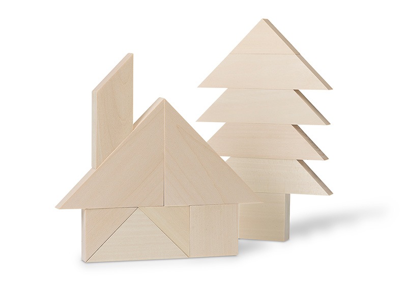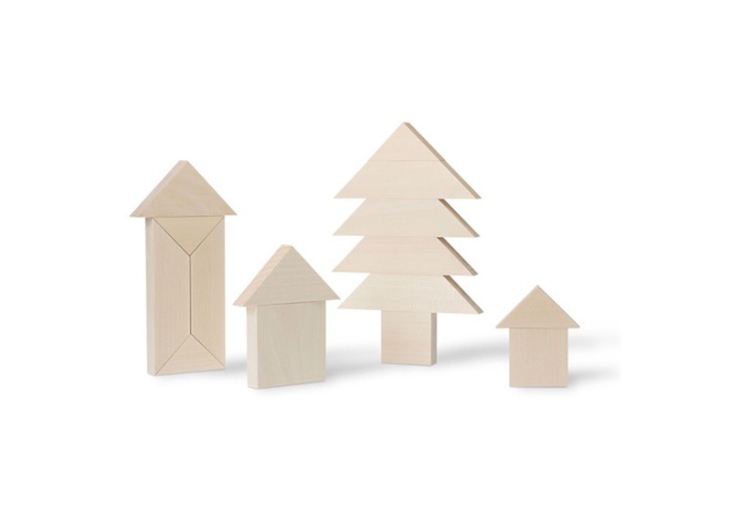 自然の情景をイメージした温かみのあるハンドメイド積み木。カッティングされた形に想像力が触発されます。パッケージも美しく、そのまま置いても、組み上げて置いても絵になる逸品。木材は、FSCやPEFCに基づくリンデット・ウッドを使用し、すべて自然な方法で白木となっています。