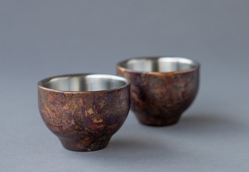 新潟県燕市の金属加工と、富山県高岡市の銅器着色。歴史ある日本伝統の技術が融合した、特別な逸品ぐい呑みです。魔法瓶などと同じ二重構造のため、熱いものは熱いまま、冷たいものは冷たいまま、長時間適温を保ちます。富山県高岡市の銅器着色は「着色」といっても塗装ではなく、銅や真鍮が持つ腐食性を利用し、薬品や炎を操って色彩を生み出す日本伝統の技術です。熟練職人の手とイマジネーションにより、金属の腐食や錆びを人為的に発生させた風合いと色彩は、まさに唯一無二。同じものはふたつとない、特別な逸品です。桐箱に入れてお届けするので、贈り物としてもおすすめです。