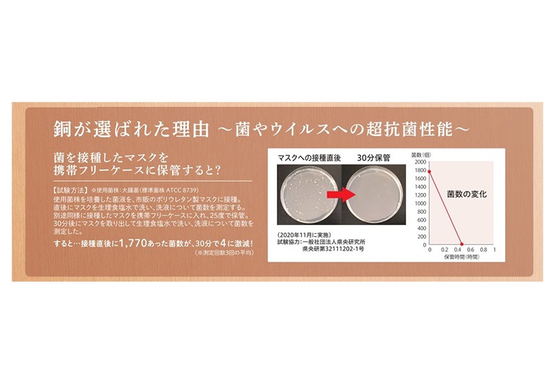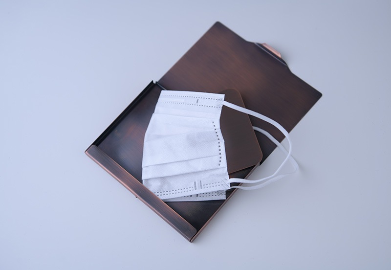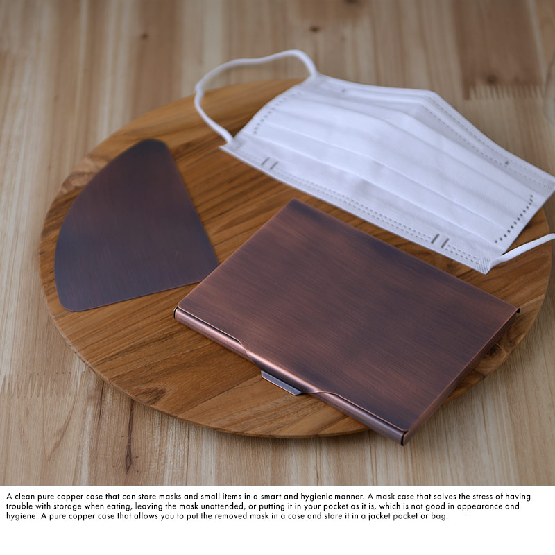 マスクや小物をスマートに衛生的に収納できる清潔な純銅製のケース。食事の時に置き場に困り、放置されたマスクや、そのままポケットに入れるなど見た目も衛生的にも良くない、そんなストレスを解決するマスクケース。外したマスクをケースに入れてジャケットのポケットや、鞄にしまえる純銅製のケース。素材である銅の抗菌作用を利用したケースで、付属の抗菌プレートをたたんだマスクやハンカチにプレートを挟んでケースに入れると効果アップです。家族や会社の同僚、会食相手、給仕者に対して、マスクの取り外しのエチケットマナーに好感を持たせてくれます。日本が世界に誇る金属加工の町、新潟県燕市の熟練職人による逸品。化粧箱付きでプレゼントにもおすすめです。