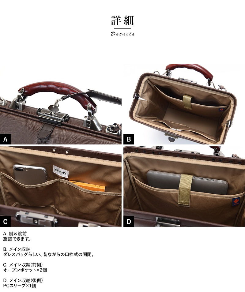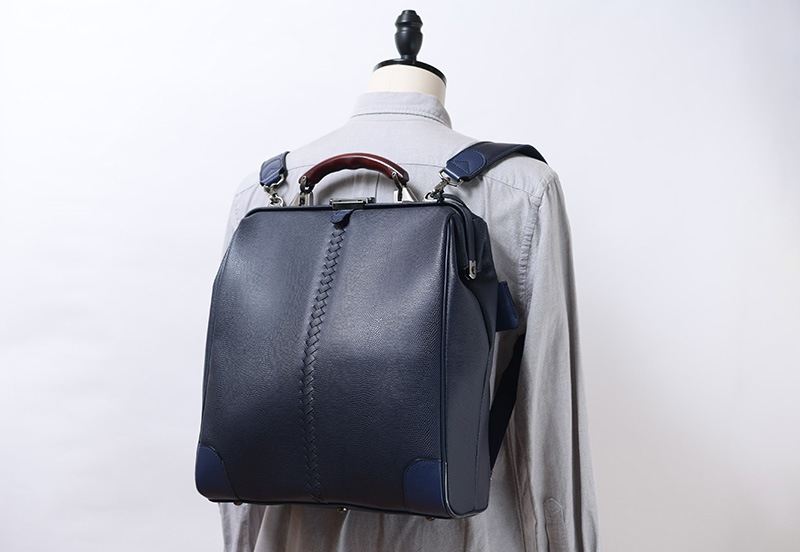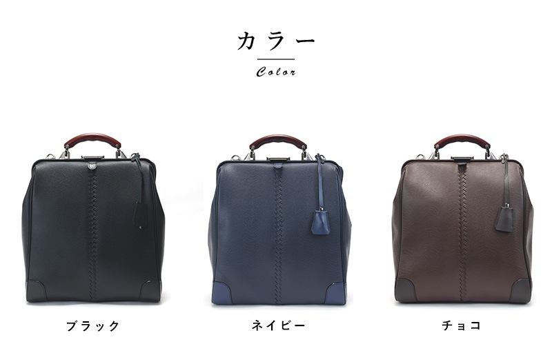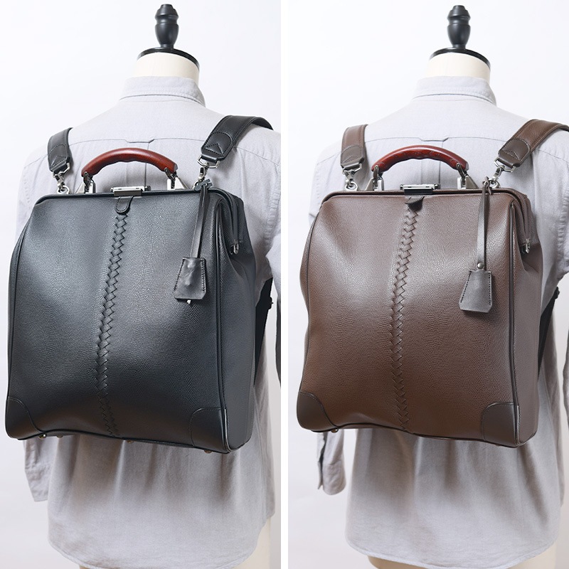 東京のビジネスバッグブランド「YOUTA」と兵庫県の「豊岡鞄」がコラボした縦型ダレスリュック。素材には、発色が鮮やかなリザード型押しの合成皮革を使用。軽量ながら傷や雨に強く、高級感も備えた機能的な素材です。クラシックスタイルの定番であるダレスバックを縦型にすることで、ビジネスシーンでの幅を広げました。移動に便利なリュックサック、ハンドルでの手持ち、ショルダーバッグと、3wayでご使用いただけます。開口部が180度開く使いやすさはもちろん、ビジネススタイルにも合うデザイン。16インチまでのPCが収納できるポケットに加え、可動式で自由に設置できるファスナーポケット付き仕切りも備えています。持っても置いても、存在感があるビジネスバッグです。