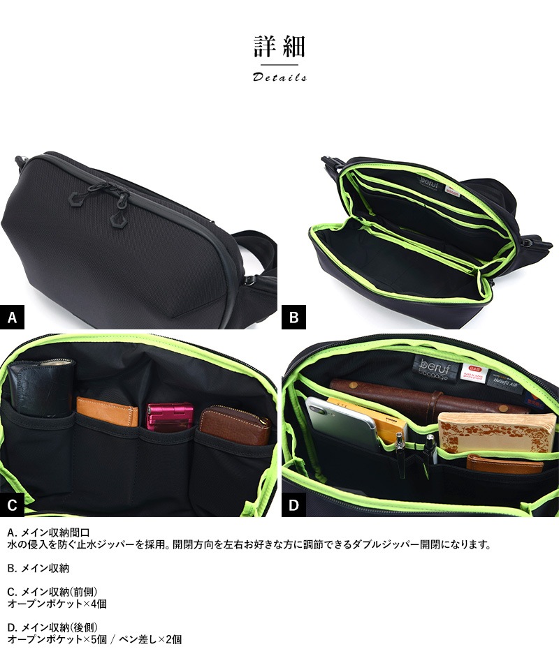 東京の自転車生活サポートグッズブランド「beruf baggage」と兵庫県の「豊岡鞄」がコラボした豊岡認定鞄の機能的ボディバッグです。素材には、軽量性・耐久性・耐水性を兼ね備えた「バリスティックホロフィルエアー」を使用。出し入れのしやすさと十分な視界性を確保した大開口のメイン収納に、内装の前面スペースは、型崩れ防止の硬質ウレタンフォーム内蔵で丈夫です。メイン収納にはタブレット(24cm×15cm程度)や各種ケーブル、モバイルバッテリー、ポケットWiFiなどのモバイルデバイスを分けて収納できる細かなポケット付き。背面のクッションパッドの裏側に配置した安全性の高いポケットも便利です。機能的で丈夫な、自転車にも普段使いにも使えるボディバッグです。