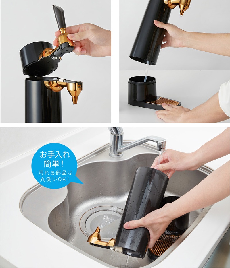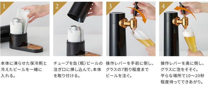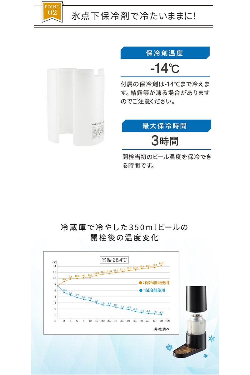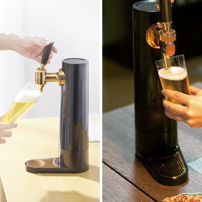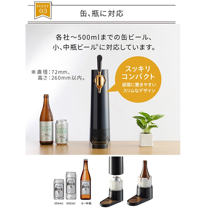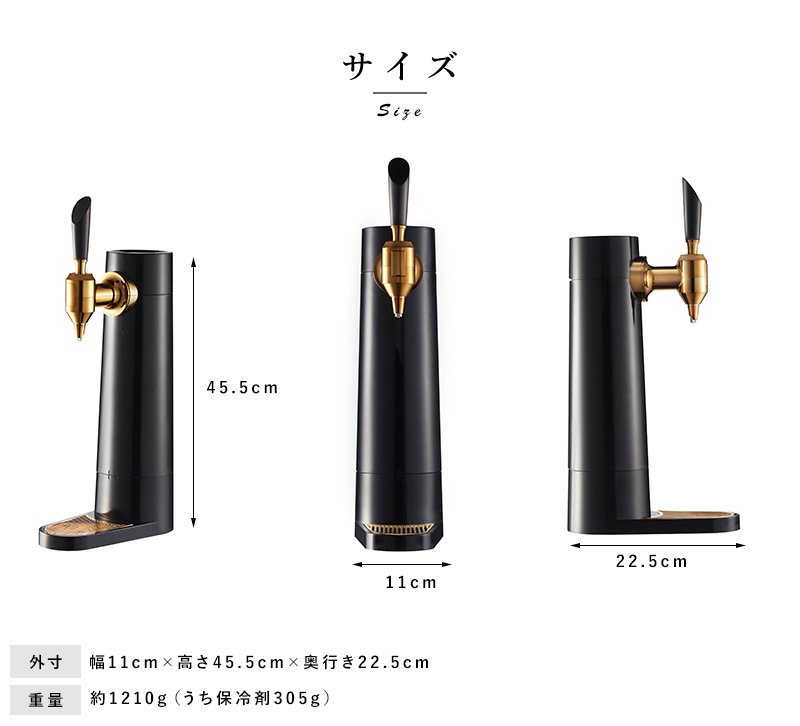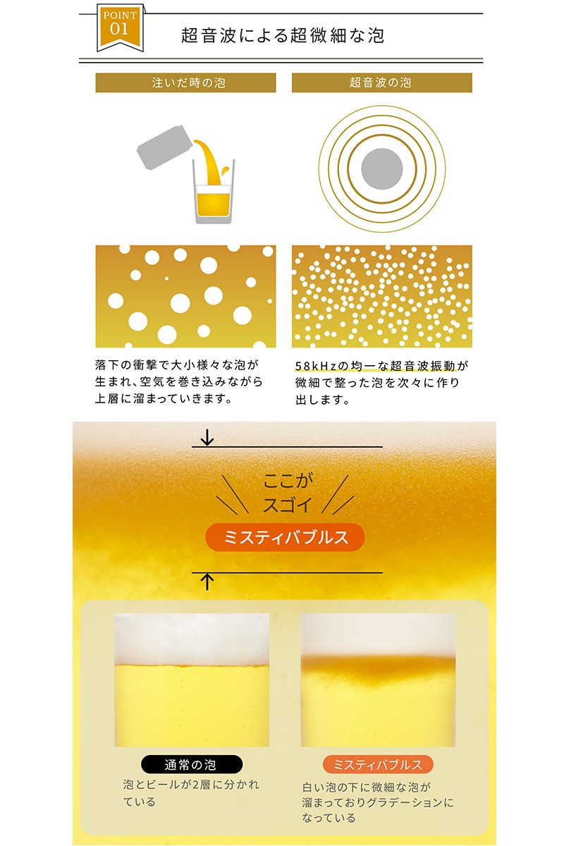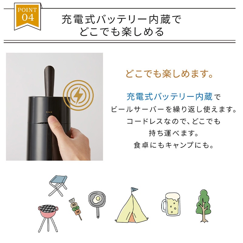 ビアホールやバー気分を味わえる超音波式スタンドビアサーバー。超音波で作り出すキメの細かいクリーミーなミスティバブルス。-14℃まで下がる氷点下保冷剤が付いており、キンキンのビールを最大3時間キープできます。330ml缶、350ml缶、500ml缶、小瓶、中瓶と対応幅も多いのでお好みのビールや発泡酒など様々なドリンクに使用可能です。コードレスの充電式バッテリーが内蔵されているのでアウトドアでも使うことが可能です。丸洗い可能なのでお手入れも簡単。自宅で一味違うビールを味わえるビールサーバーです。