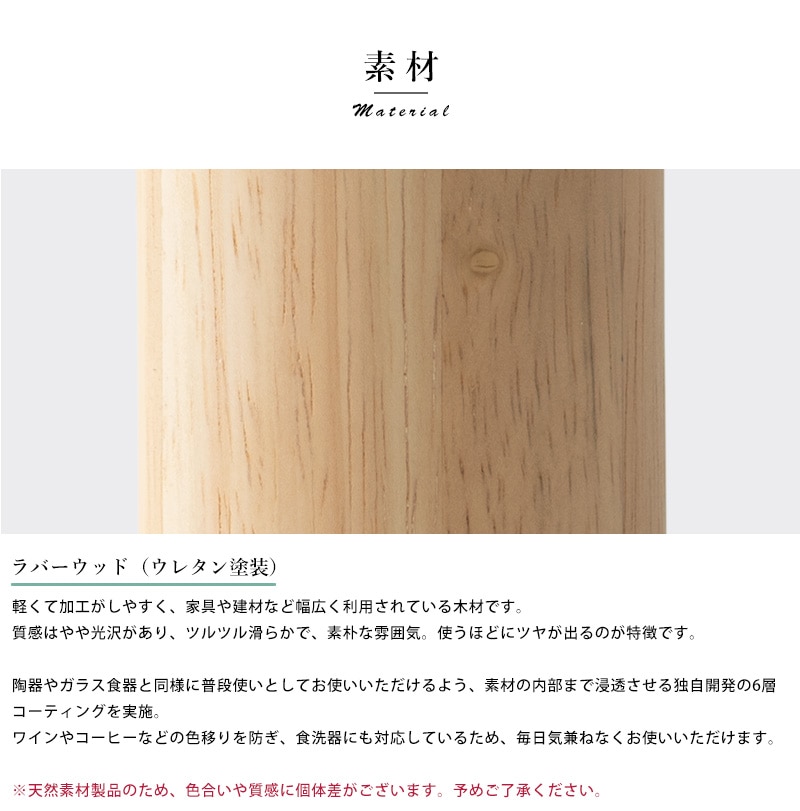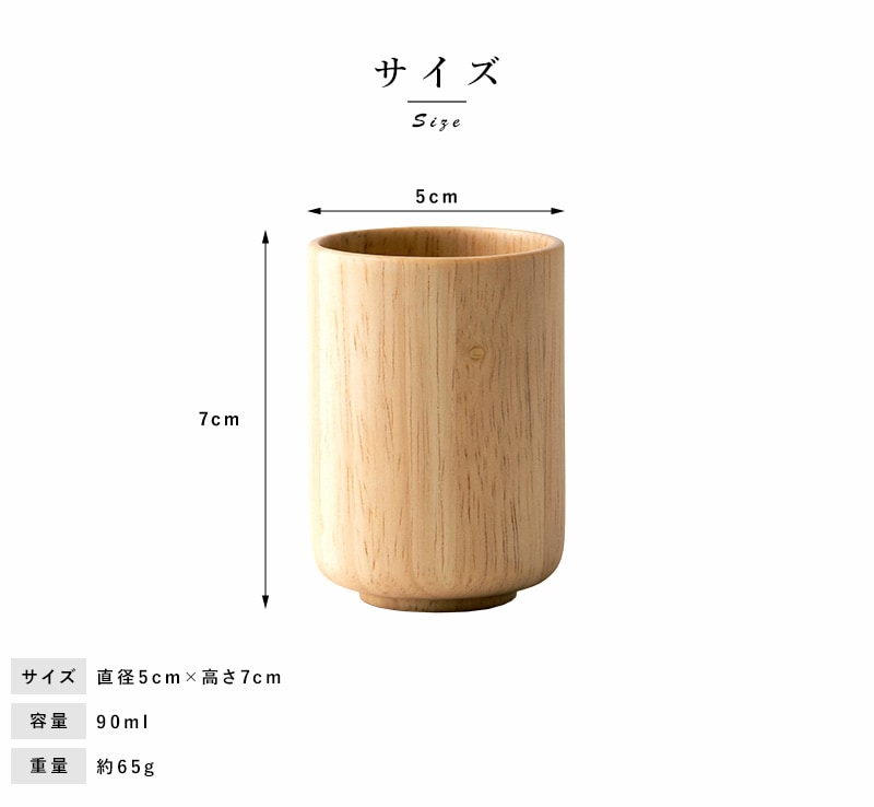 天然木を使用した素朴なコップ。小ぶりな90mlサイズです。素材として使用しているラバーウッドは、やや光沢のある質感と滑らかな手触りが特徴の木材。使うほどにツヤを増し、味わいを深めていきます。独自開発の6層コーティングを施してあるため、ワインやコーヒーなどの色移りを防ぎ、食洗器にも対応。陶器やガラス食器と同じ感覚で、毎日気兼ねなくお使いいただけます。