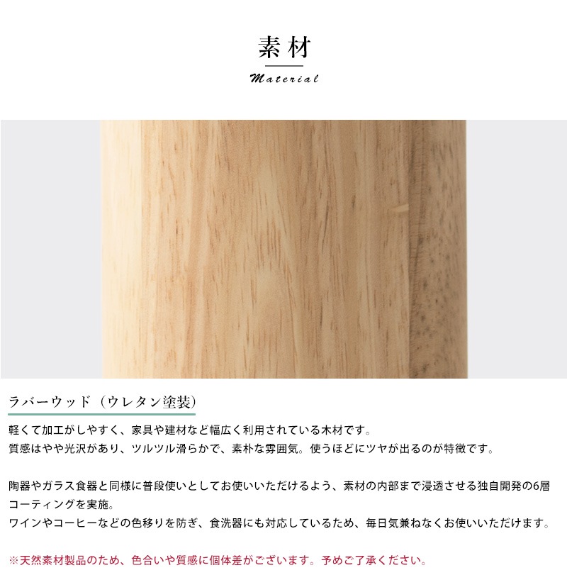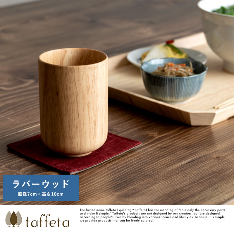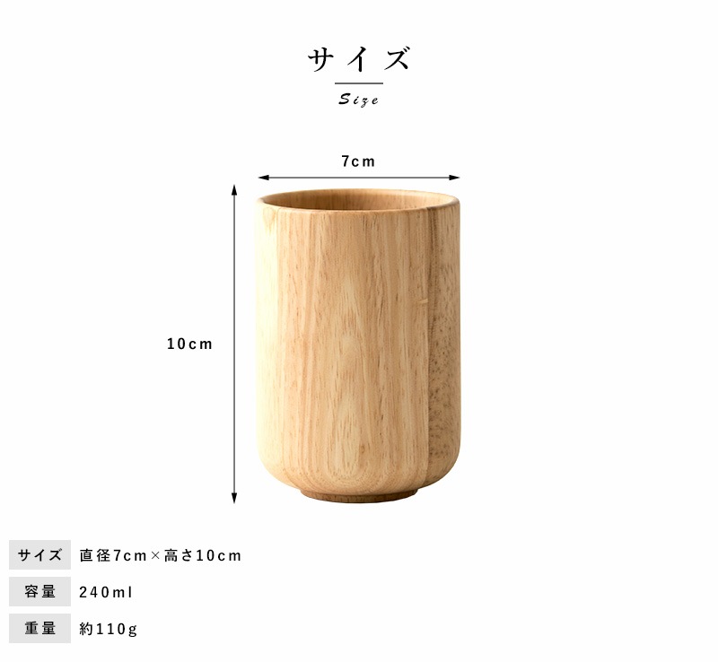 天然木を使用した素朴なコップ。たっぷり飲める240mlサイズです。素材として使用しているラバーウッドは、やや光沢のある質感と滑らかな手触りが特徴の木材。使うほどにツヤを増し、味わいを深めていきます。独自開発の6層コーティングを施してあるため、ワインやコーヒーなどの色移りを防ぎ、食洗器にも対応。陶器やガラス食器と同じ感覚で、毎日気兼ねなくお使いいただけます。