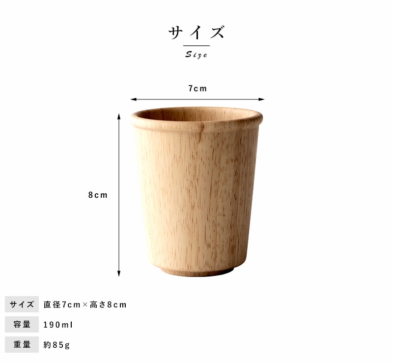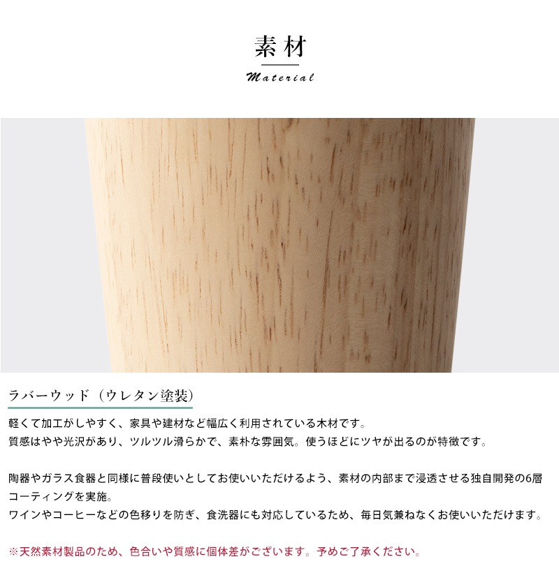 天然木を使用した素朴なコップ。ほどよい大きさの190mlサイズです。素材として使用しているラバーウッドは、やや光沢のある質感と滑らかな手触りが特徴の木材。使うほどにツヤを増し、味わいを深めていきます。独自開発の6層コーティングを施してあるため、ワインやコーヒーなどの色移りを防ぎ、食洗器にも対応。陶器やガラス食器と同じ感覚で、毎日気兼ねなくお使いいただけます。