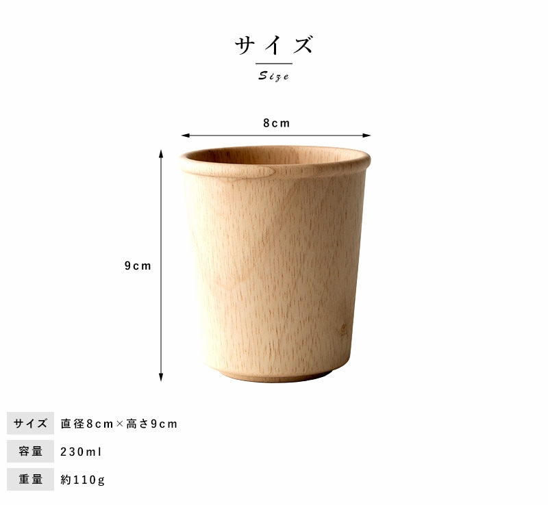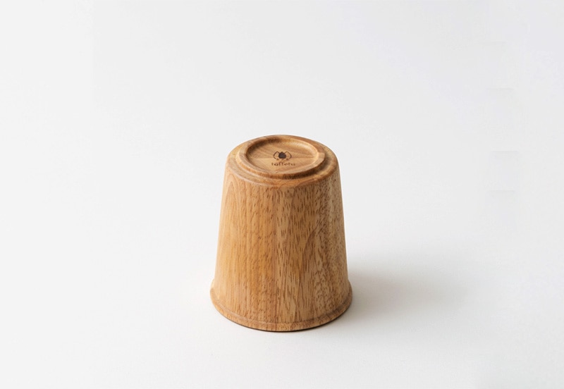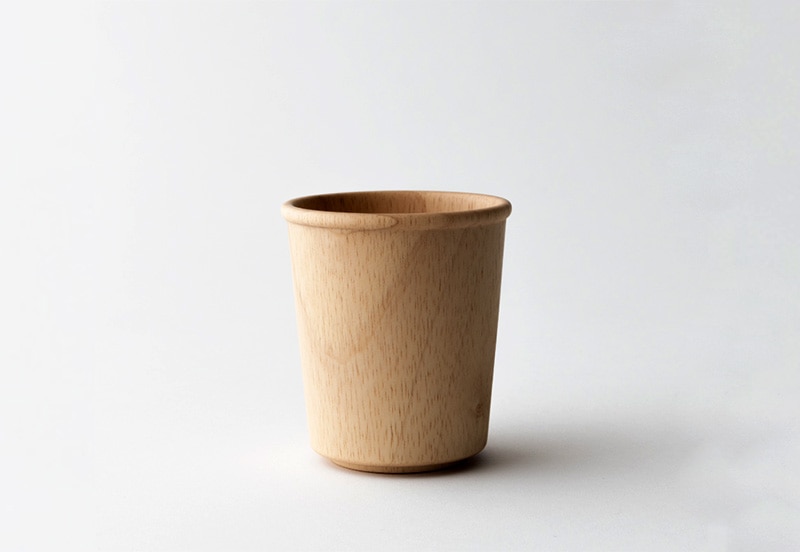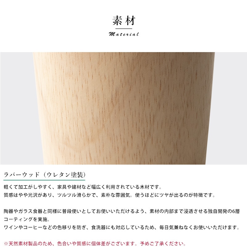 天然木を使用した素朴なコップ。たっぷり飲める230mlサイズです。素材として使用しているラバーウッドは、やや光沢のある質感と滑らかな手触りが特徴の木材。使うほどにツヤを増し、味わいを深めていきます。独自開発の6層コーティングを施してあるため、ワインやコーヒーなどの色移りを防ぎ、食洗器にも対応。陶器やガラス食器と同じ感覚で、毎日気兼ねなくお使いいただけます。