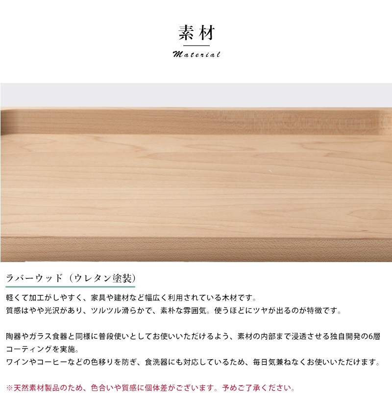 天然木を使用した素朴なトレイ。朝食やランチなど、食膳としても使える大きめサイズです。素材として使用しているラバーウッドは、やや光沢のある質感と滑らかな手触りが特徴の木材。使うほどにツヤを増し、味わいを深めていきます。独自開発の6層コーティングを施してあるため、食洗器にも対応。毎日気兼ねなくお使いいただけます。