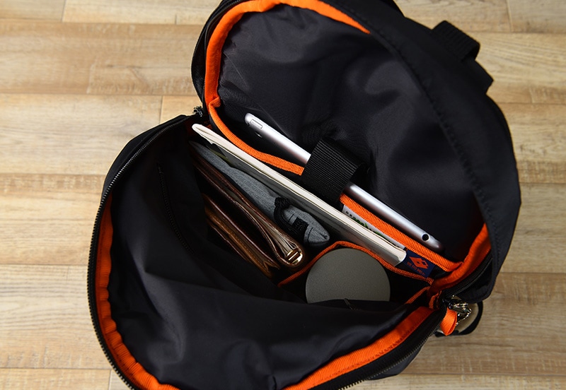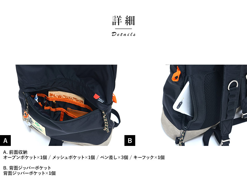 WALK ABOUT by SANPAKと「豊岡鞄」のコラボレーションバックパック。懐かしい牛床革とのコンビネーションとWALKABOUTオリジナルのブランド織ネームがレトロな雰囲気を演出しています。背負った時、如何に快適であるかを追求し、背負いベルトの湾曲形状と背面の凹凸による通気性にもこだわりました。前面収納に小物ポケット、ペンホルダー、レスキューオレンジのキーフック付き、背面には防犯用のシークレットポケット。本体内装には、ファスナーポケットとPCスリーブ及びペットボトル等ホルダー(保冷シート)。内装の「デオドラントネーム」は消臭効果を備えた機能性織ネームです。スモールサイズでちょっとした外出に適したリュックサックです。