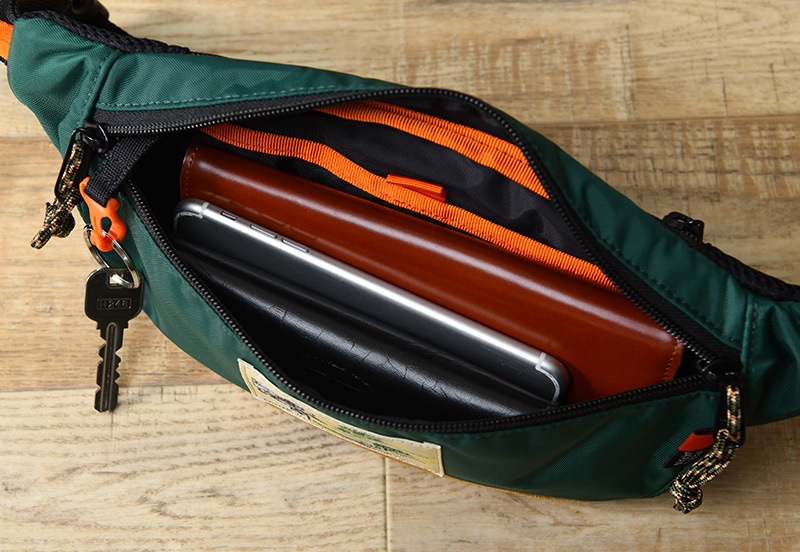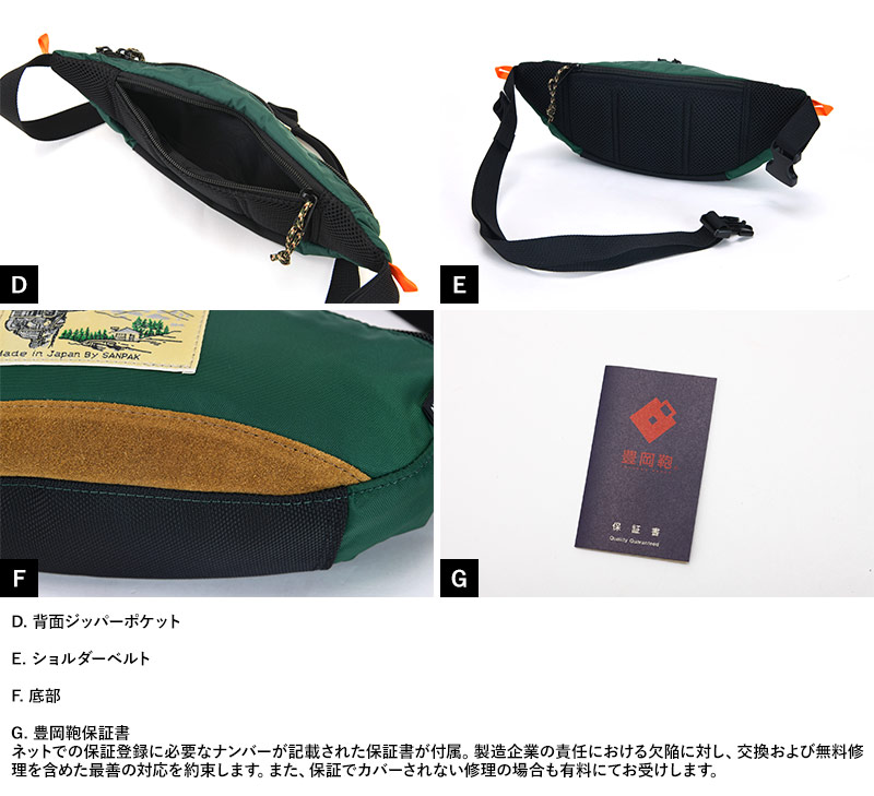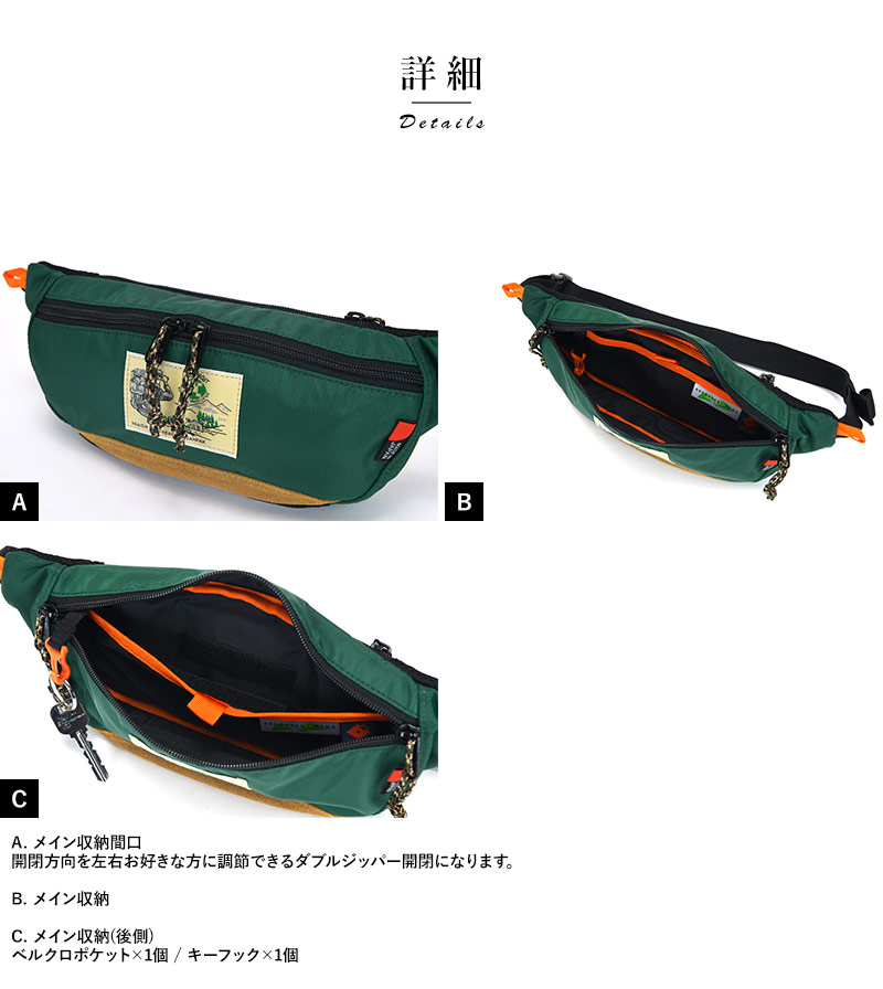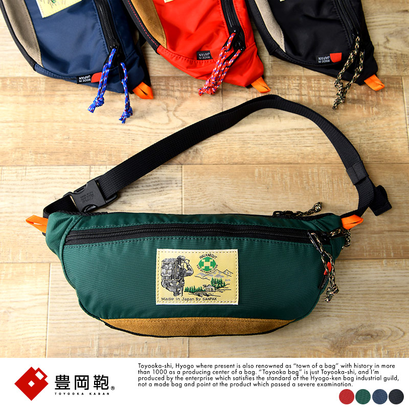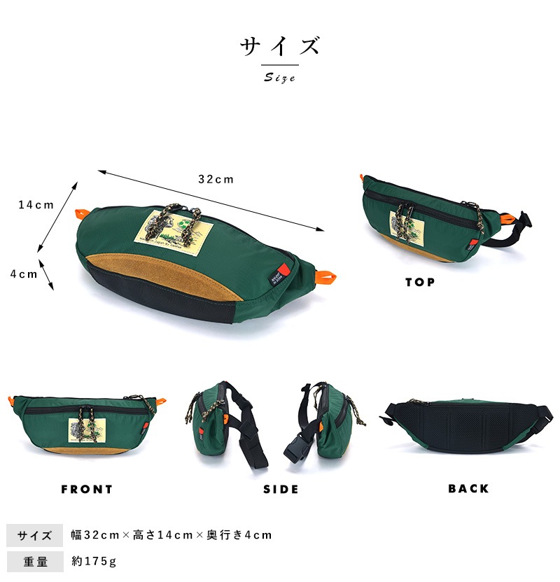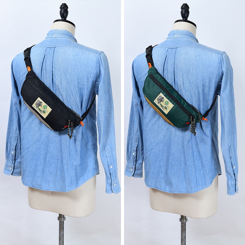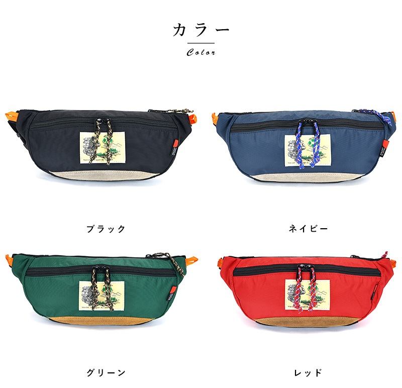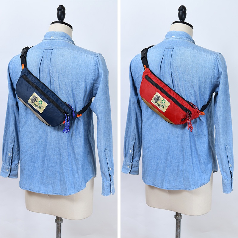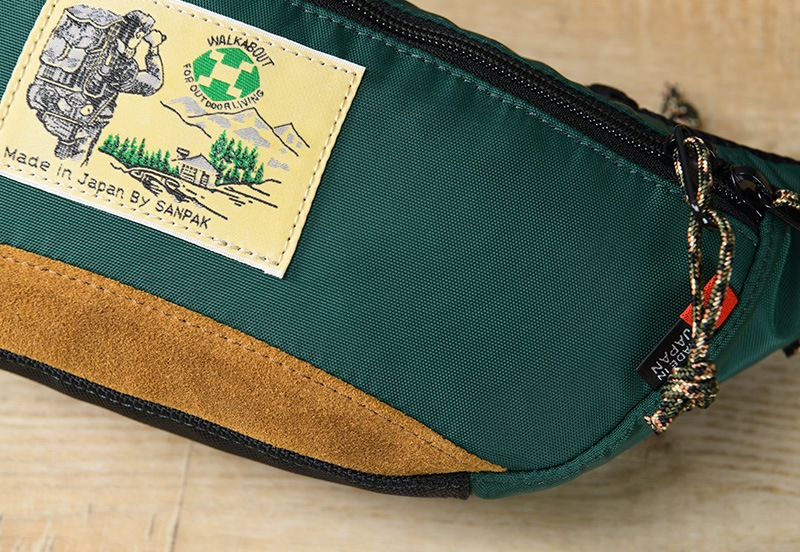 WALK ABOUT by SANPAKと「豊岡鞄」のコラボレーションウエストバッグ。懐かしい牛床革とのコンビネーションとWALKABOUTオリジナルのブランド織ネームがレトロな雰囲気を演出しています。フロントデザインは丸く立体的に仕上げた優しいフォルム。前面収納に小物ポケット、レスキューオレンジのキーフック付き、背面には防犯用のシークレットポケット。ベルトにはワンタッチで脱着できるDuraflex社の樹脂バックルを使用し、長さを調節することで、たすき掛けにしてボディバッグとしてもご使用いただけます。内装の「デオドラントネーム」は消臭効果を備えた機能性織ネームです。使い勝手の良い撥水ウエストバッグです。