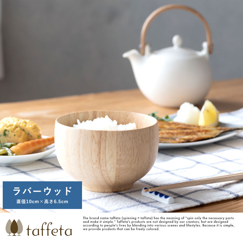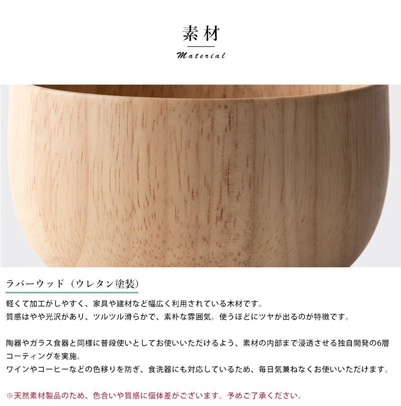 天然木を使用した素朴なお椀。素材として使用しているラバーウッドは、やや光沢のある質感と滑らかな手触りが特徴の木材。使うほどにツヤを増し、味わいを深めていきます。独自開発の6層コーティングを施してあるため色移りを防ぎ、食洗器にも対応。陶器やガラス食器と同じ感覚で、毎日気兼ねなくお使いいただけます。