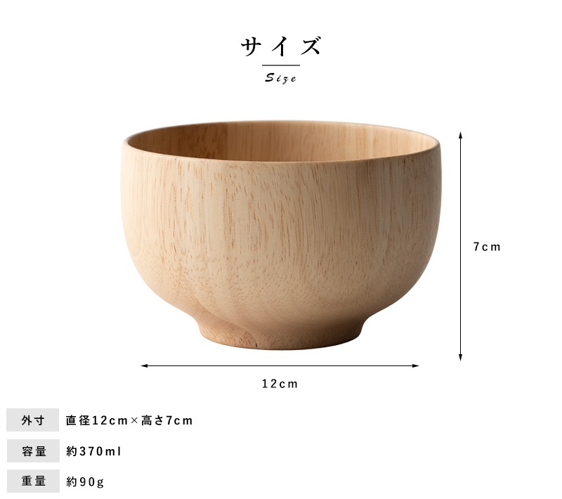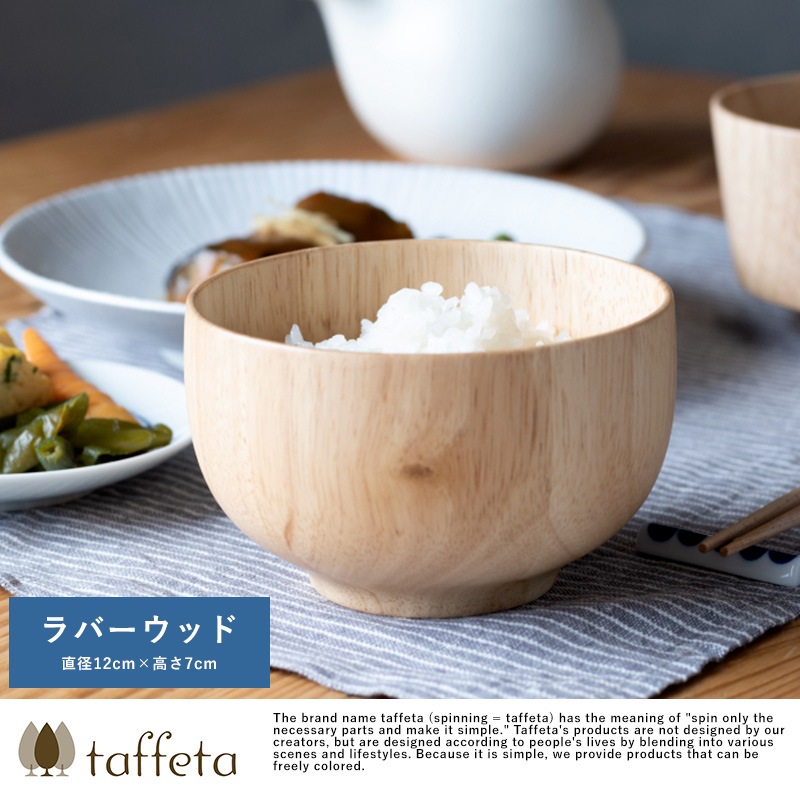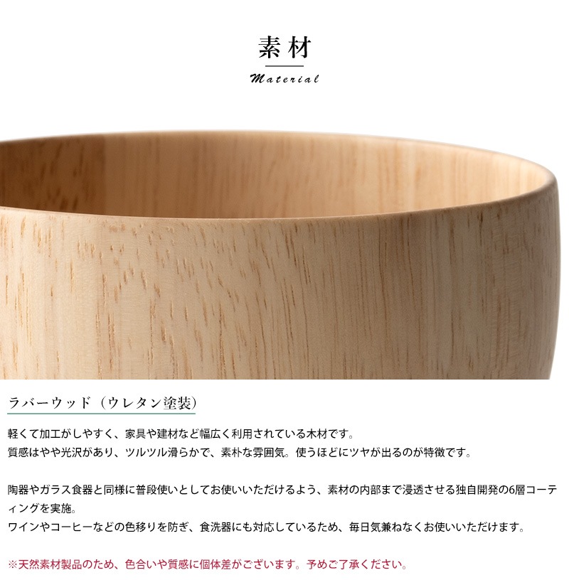 天然木を使用した素朴なお椀。素材として使用しているラバーウッドは、やや光沢のある質感と滑らかな手触りが特徴の木材。使うほどにツヤを増し、味わいを深めていきます。独自開発の6層コーティングを施してあるため色移りを防ぎ、食洗器にも対応。陶器やガラス食器と同じ感覚で、毎日気兼ねなくお使いいただけます。
