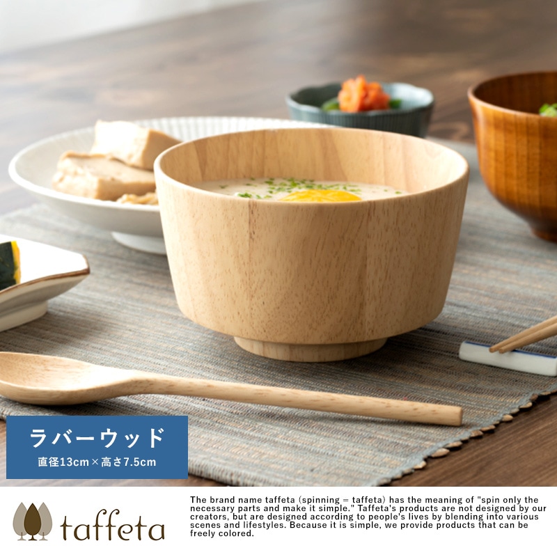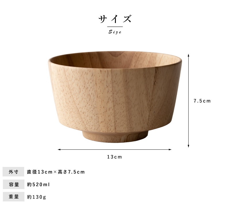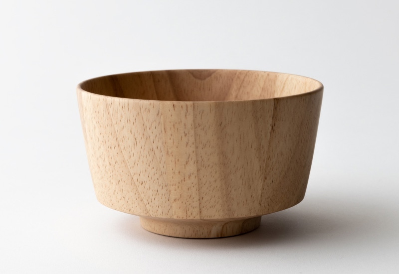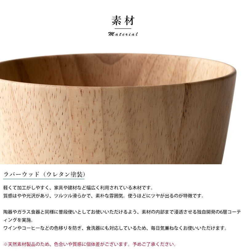 天然木を使用した素朴なお椀。素材として使用しているラバーウッドは、やや光沢のある質感と滑らかな手触りが特徴の木材。使うほどにツヤを増し、味わいを深めていきます。独自開発の6層コーティングを施してあるため色移りを防ぎ、食洗器にも対応。陶器やガラス食器と同じ感覚で、毎日気兼ねなくお使いいただけます。