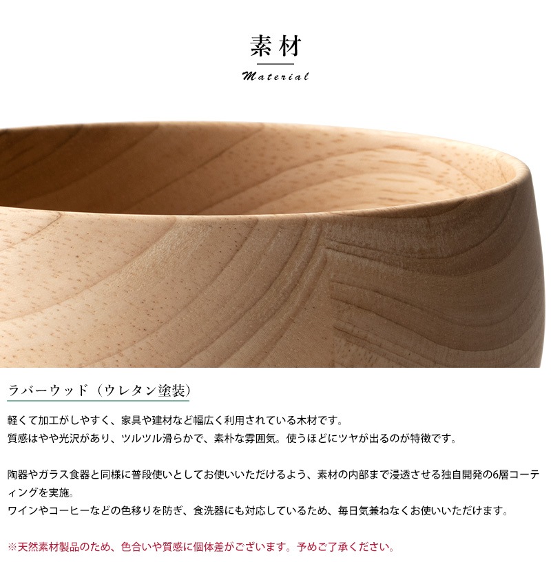 天然木を使用した素朴なサラダボウル。素材として使用しているラバーウッドは、やや光沢のある質感と滑らかな手触りが特徴の木材。使うほどにツヤを増し、味わいを深めていきます。独自開発の6層コーティングを施してあるため、色移りを防ぎ、食洗器にも対応。陶器やガラス食器と同じ感覚で、毎日気兼ねなくお使いいただけます。