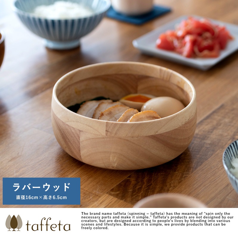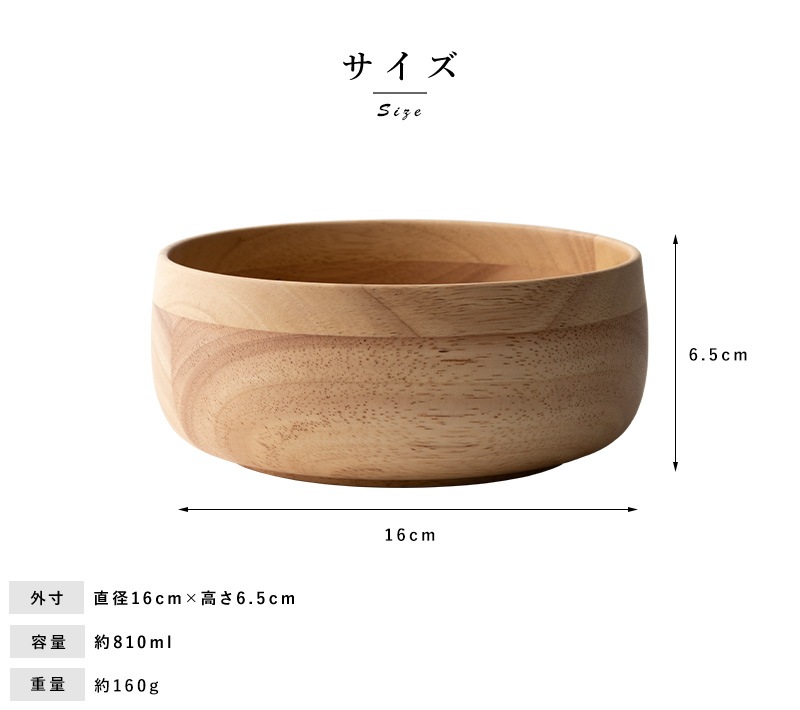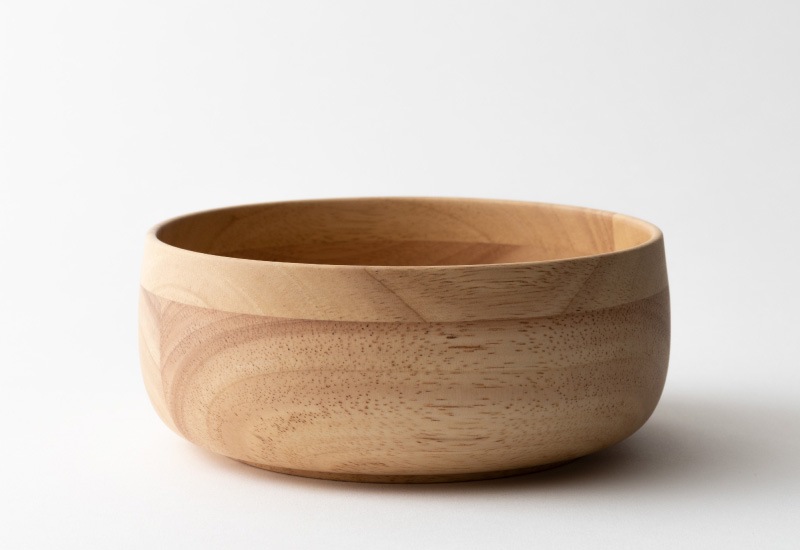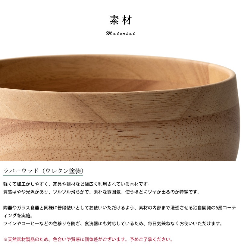 天然木を使用した素朴なサラダボウル。素材として使用しているラバーウッドは、やや光沢のある質感と滑らかな手触りが特徴の木材。使うほどにツヤを増し、味わいを深めていきます。独自開発の6層コーティングを施してあるため、色移りを防ぎ、食洗器にも対応。陶器やガラス食器と同じ感覚で、毎日気兼ねなくお使いいただけます。