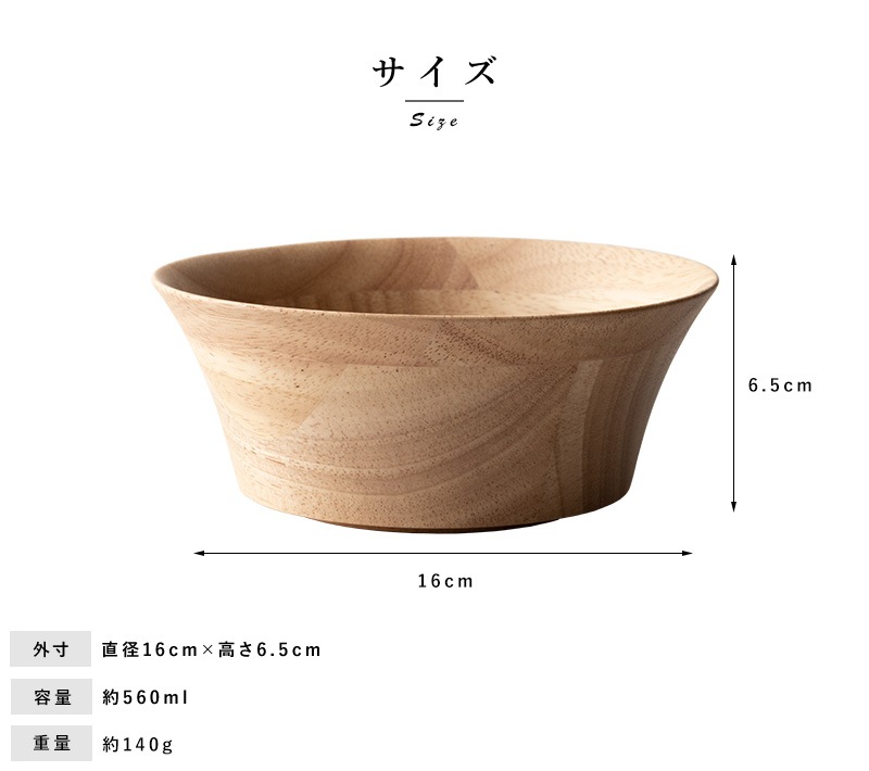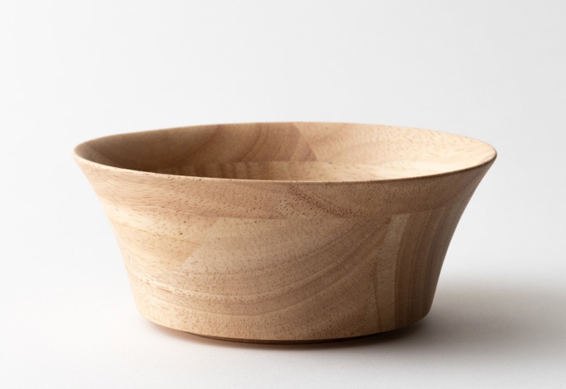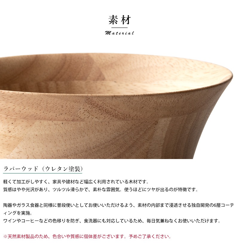 天然木を使用した素朴なサラダボウル。素材として使用しているラバーウッドは、やや光沢のある質感と滑らかな手触りが特徴の木材。使うほどにツヤを増し、味わいを深めていきます。独自開発の6層コーティングを施してあるため、色移りを防ぎ、食洗器にも対応。陶器やガラス食器と同じ感覚で、毎日気兼ねなくお使いいただけます。