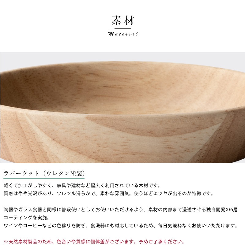 天然木を使用した素朴な深皿。素材として使用しているラバーウッドは、やや光沢のある質感と滑らかな手触りが特徴の木材。使うほどにツヤを増し、味わいを深めていきます。独自開発の6層コーティングを施してあるため、色移りを防ぎ、食洗器にも対応。陶器やガラス食器と同じ感覚で、毎日気兼ねなくお使いいただけます。