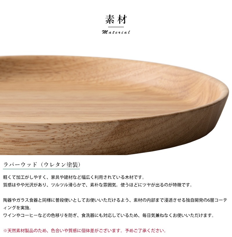 天然木を使用した素朴な深皿。素材として使用しているラバーウッドは、やや光沢のある質感と滑らかな手触りが特徴の木材。使うほどにツヤを増し、味わいを深めていきます。独自開発の6層コーティングを施してあるため、色移りを防ぎ、食洗器にも対応。陶器やガラス食器と同じ感覚で、毎日気兼ねなくお使いいただけます。