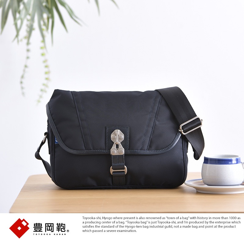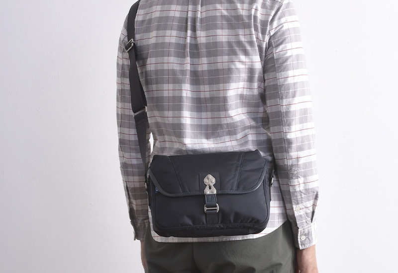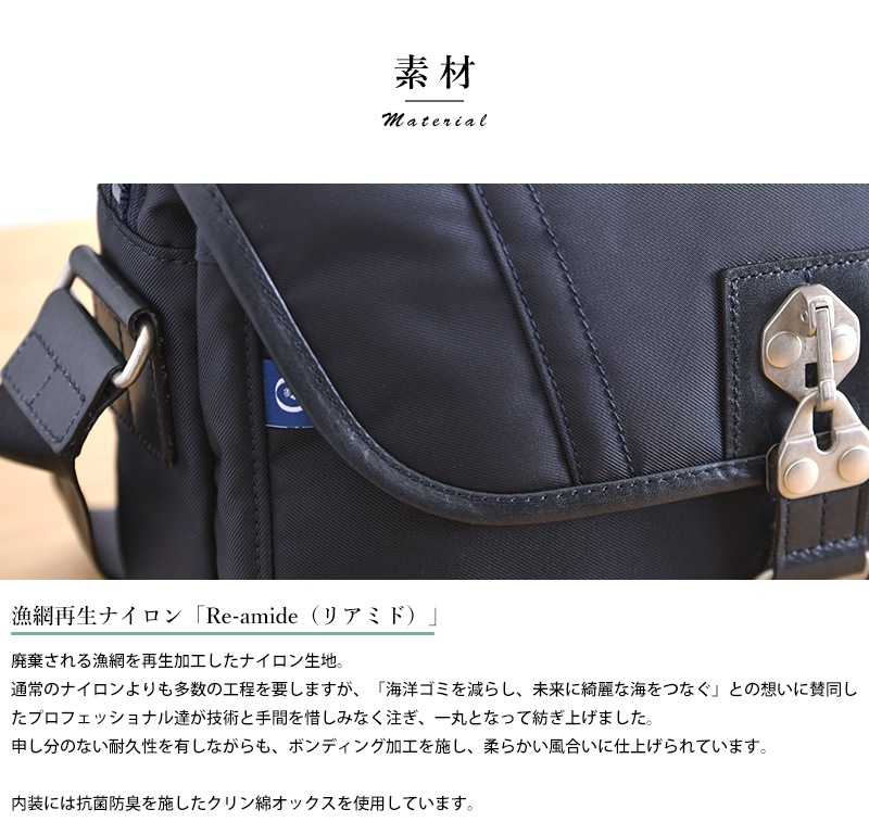100年後の子どもたちにも、恵みの多い海を。「海洋プラスチックごみ削減」と「持続可能な社会の実現」を目的とする“Product for the Blue”の想いが詰まったショルダーバッグです。素材には、廃棄される漁網を再生加工したナイロンを使用。「未来に綺麗な海をつなぐ」との想いに賛同したプロフェッショナル達が技術と手間を惜しみなく注ぎ、一丸となって紡ぎ上げたナイロンです。ボンディング加工を施し、柔らかい風合いに仕上げました。ゆがみの無いステッチや丁寧なレザーの処理など、さすが日本製と唸る丁寧なつくりで、日本が世界に誇る『豊岡鞄』の認定を受けたショルダーバッグです。