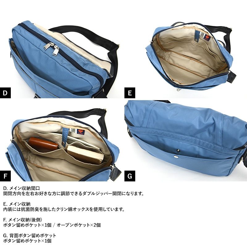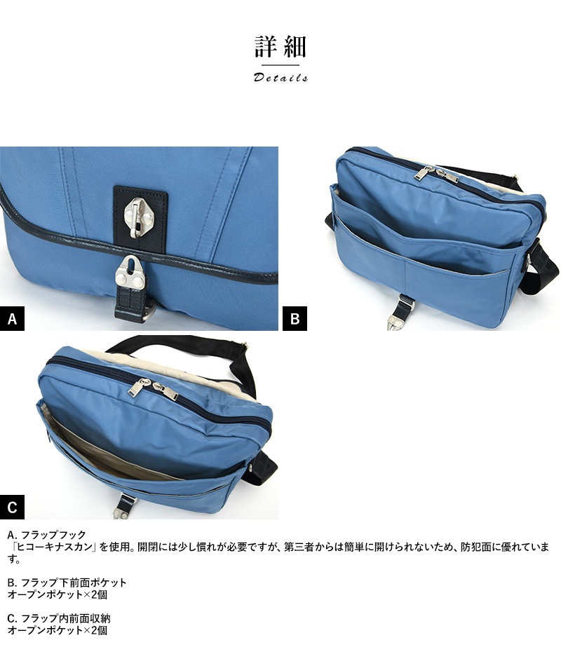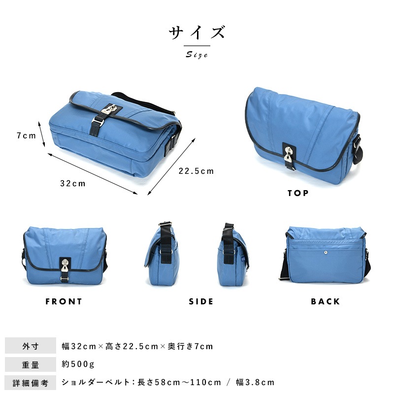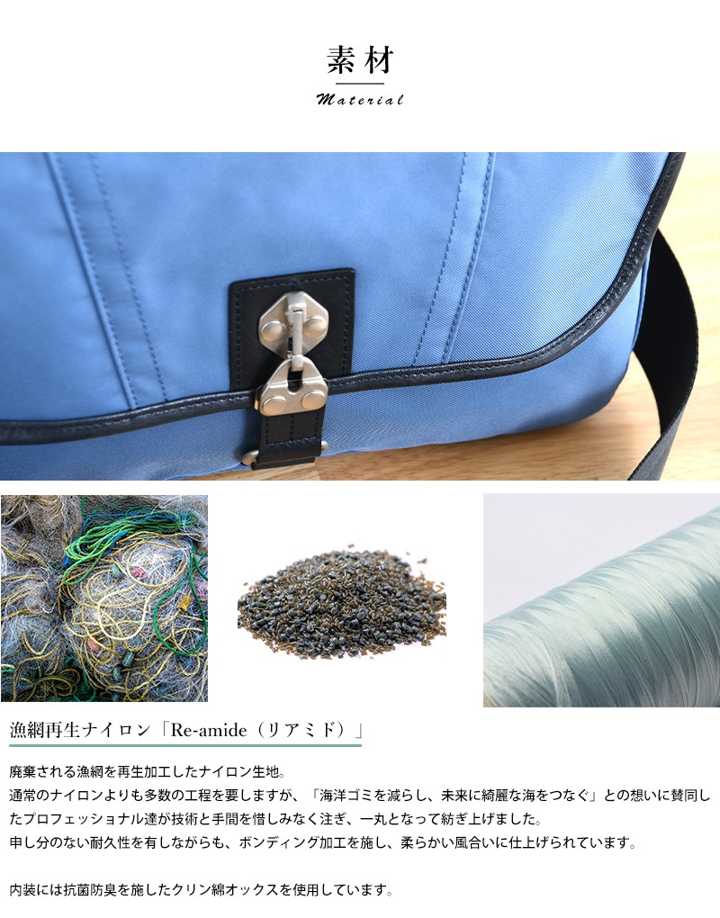 100年後の子どもたちにも、恵みの多い海を。「海洋プラスチックごみ削減」と「持続可能な社会の実現」を目的とする“Product for the Blue”の想いが詰まったショルダーバッグです。素材には、廃棄される漁網を再生加工したナイロンを使用。「未来に綺麗な海をつなぐ」との想いに賛同したプロフェッショナル達が技術と手間を惜しみなく注ぎ、一丸となって紡ぎ上げたナイロンです。ボンディング加工を施し、柔らかい風合いに仕上げました。ゆがみの無いステッチや丁寧なレザーの処理など、さすが日本製と唸る丁寧なつくりで、日本が世界に誇る『豊岡鞄』の認定を受けたショルダーバッグです。