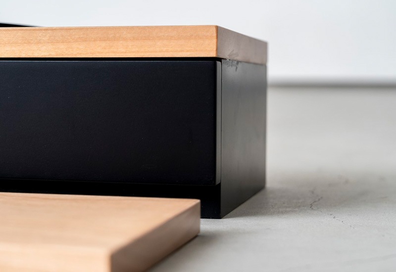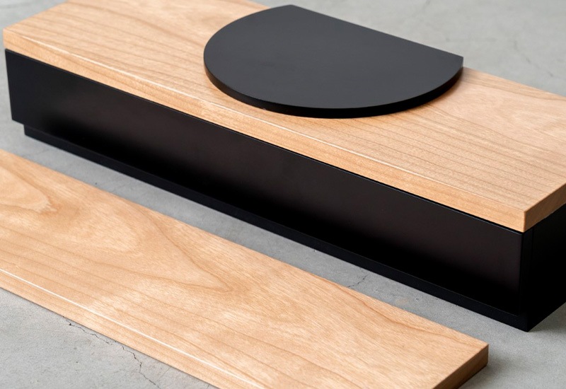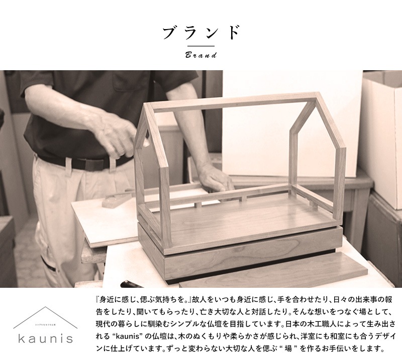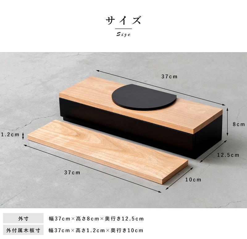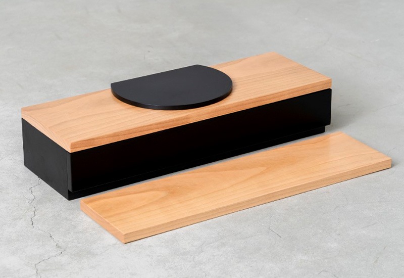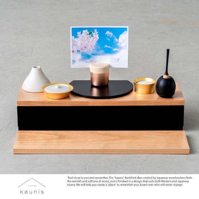 なるべくシンプルでコンパクトに、という方向けの省スペースのお仏壇。チェスト上や棚にも合うサイズで、置く場所を選びません。天板は月をイメージしており、故人との思い出を季節の移ろいや月の満ち欠けの中で感じていただければと思います。天板下は引き出しとなっており、お線香やマッチ、ロウソク等を収納できるようになっています。付属の木板は舞台枠に丁度収まるサイズなので、舞台上の高さを変えたり、仏壇の前部に置いてお花を飾ったりと、自由にお使いいただけます。